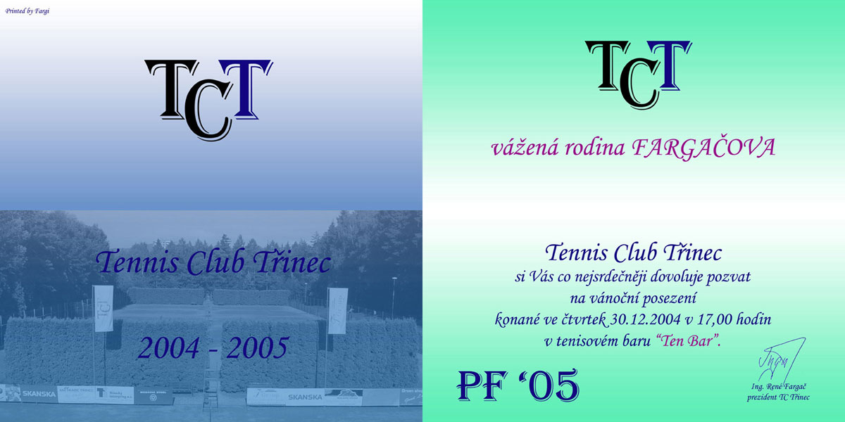Letošní vánoční posezení se konalo v tenisovém baru "Ten Bar" netradičně ve čtvrtek dne 30.prosince 2004. Setkání se tentokrát zúčastnili všichni pozvaní, nálada byla opět super, jíst a pít bylo opravdu co, kytary zněly ještě dlouho po půlnoci.