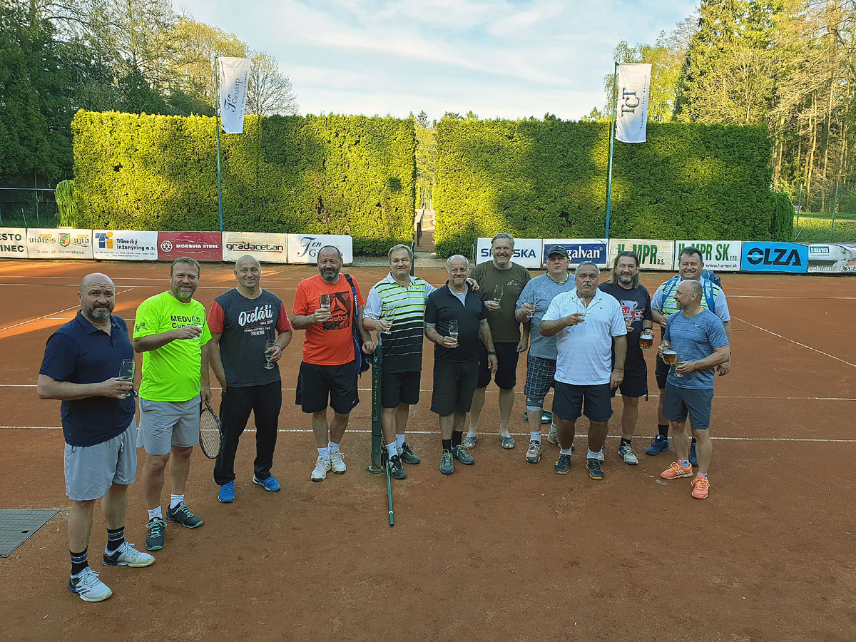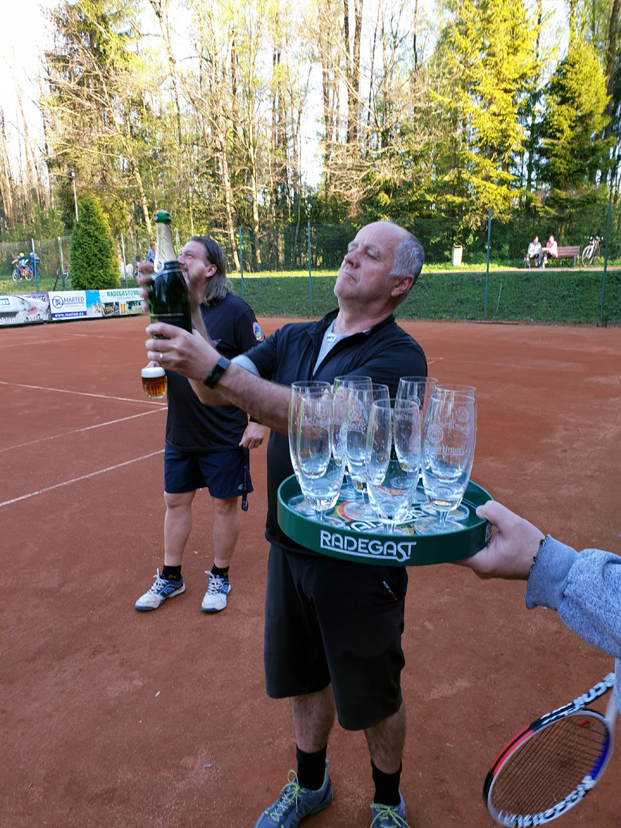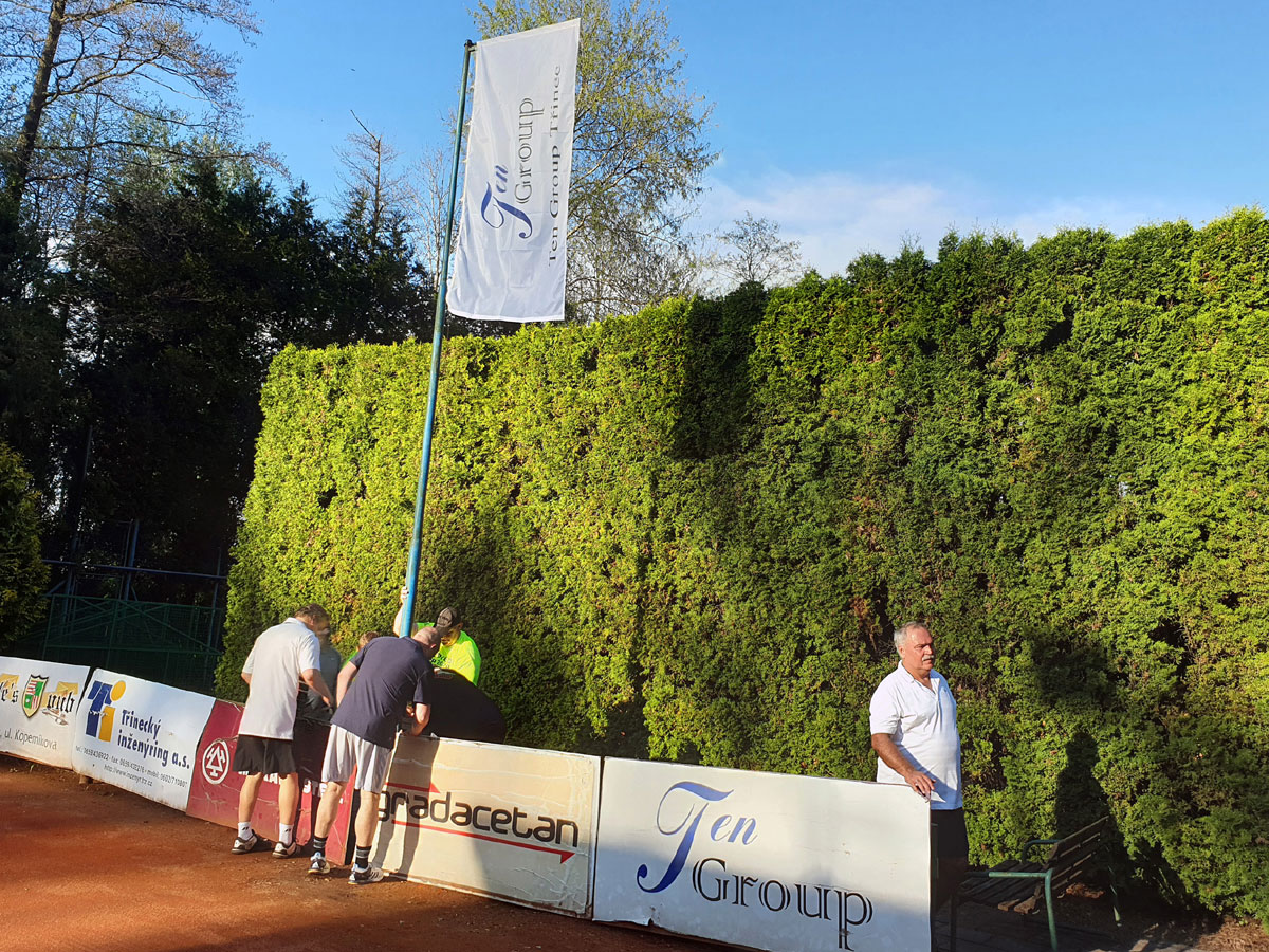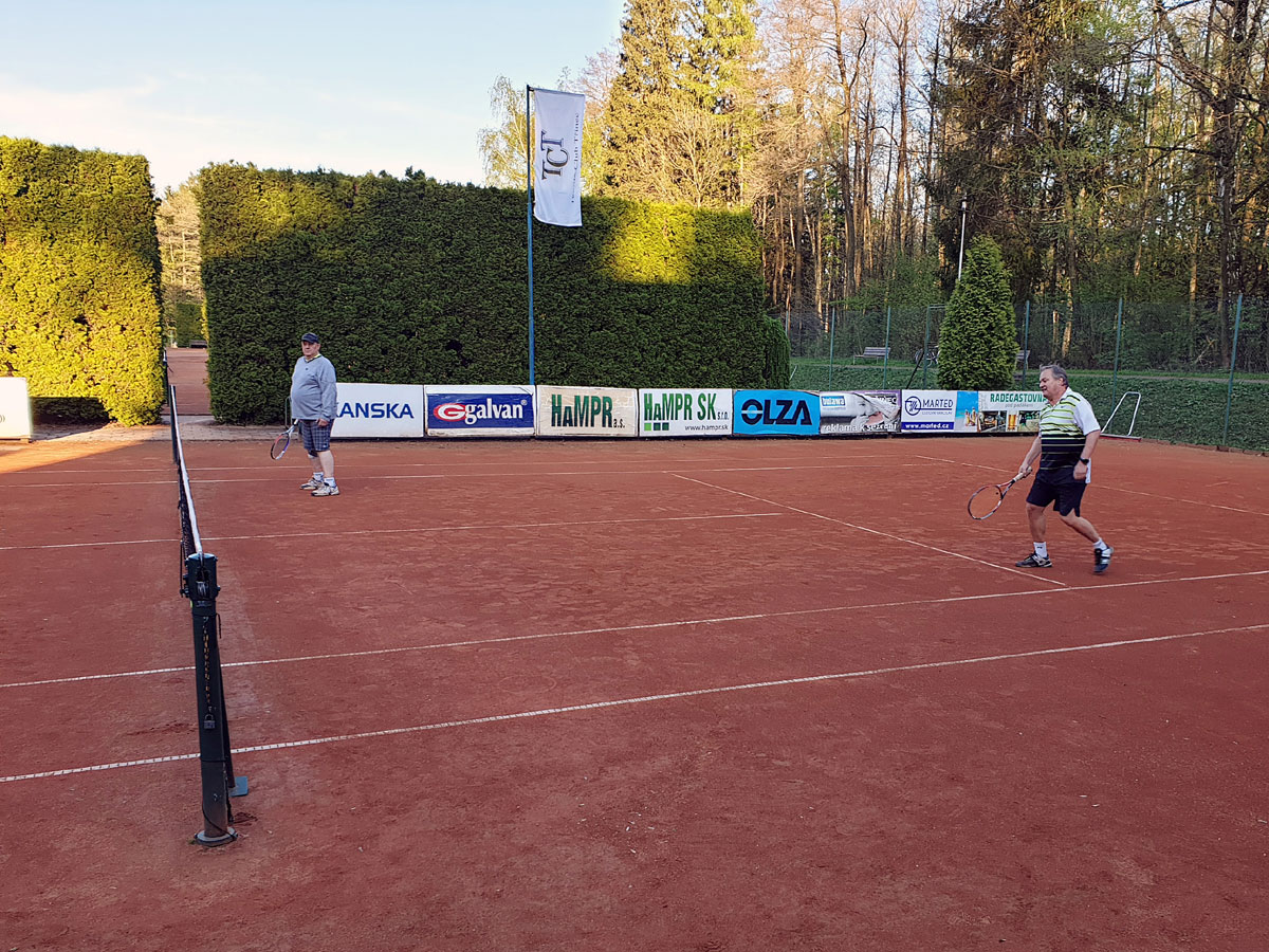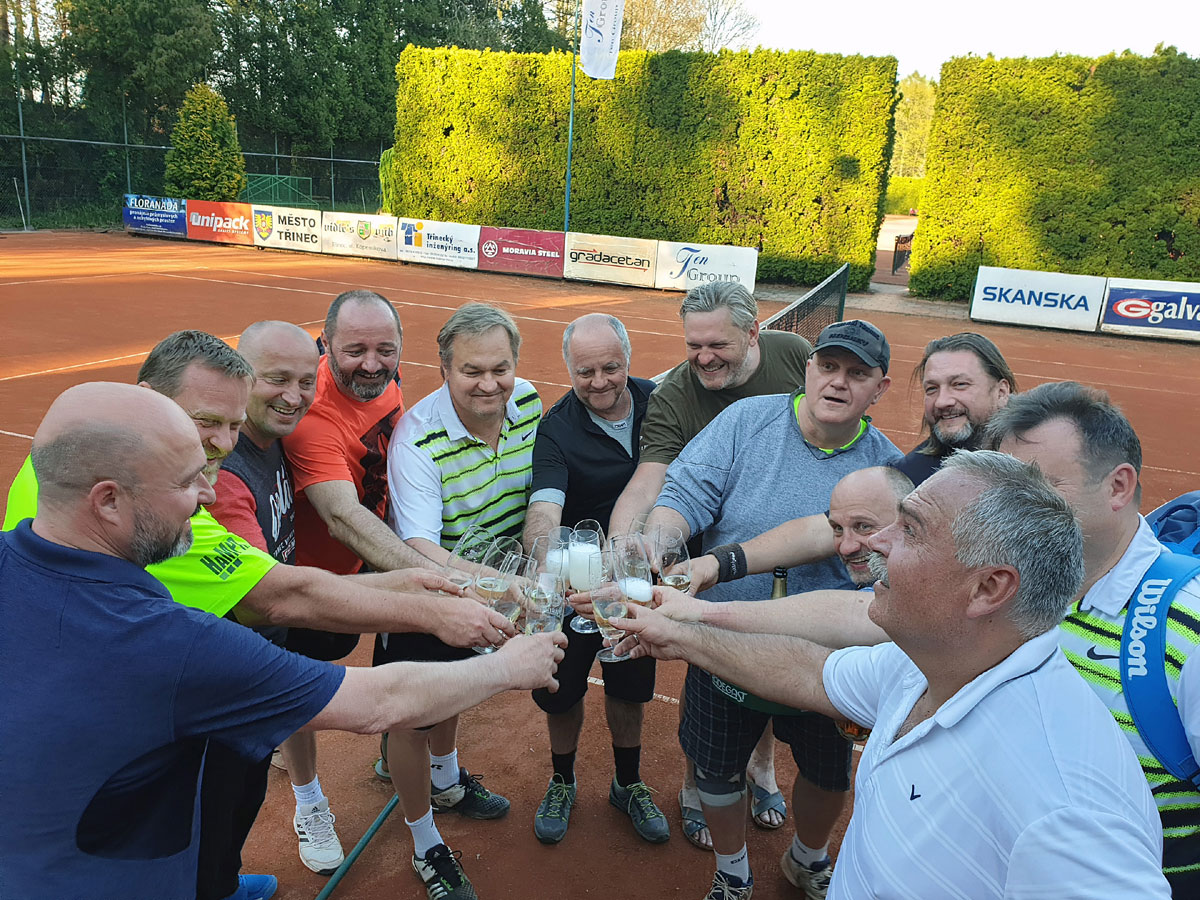 Počasí se umoudřilo a my jsme za sluníčka pověsili klubové vlajky, přiťukli jsme si šampaňským a na centrálním dvorci jsme sehráli přátelské utkání ve čtyřhře se sponzory klubu.