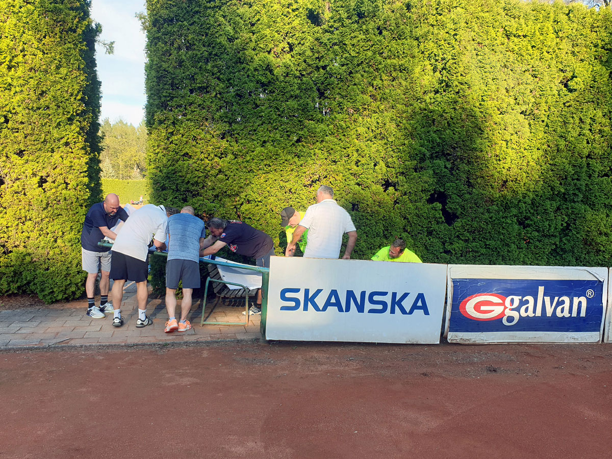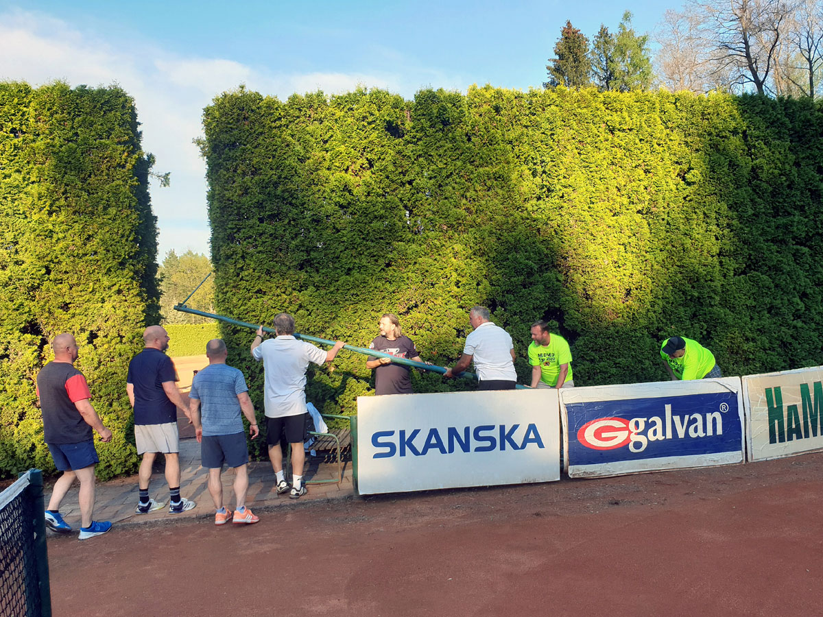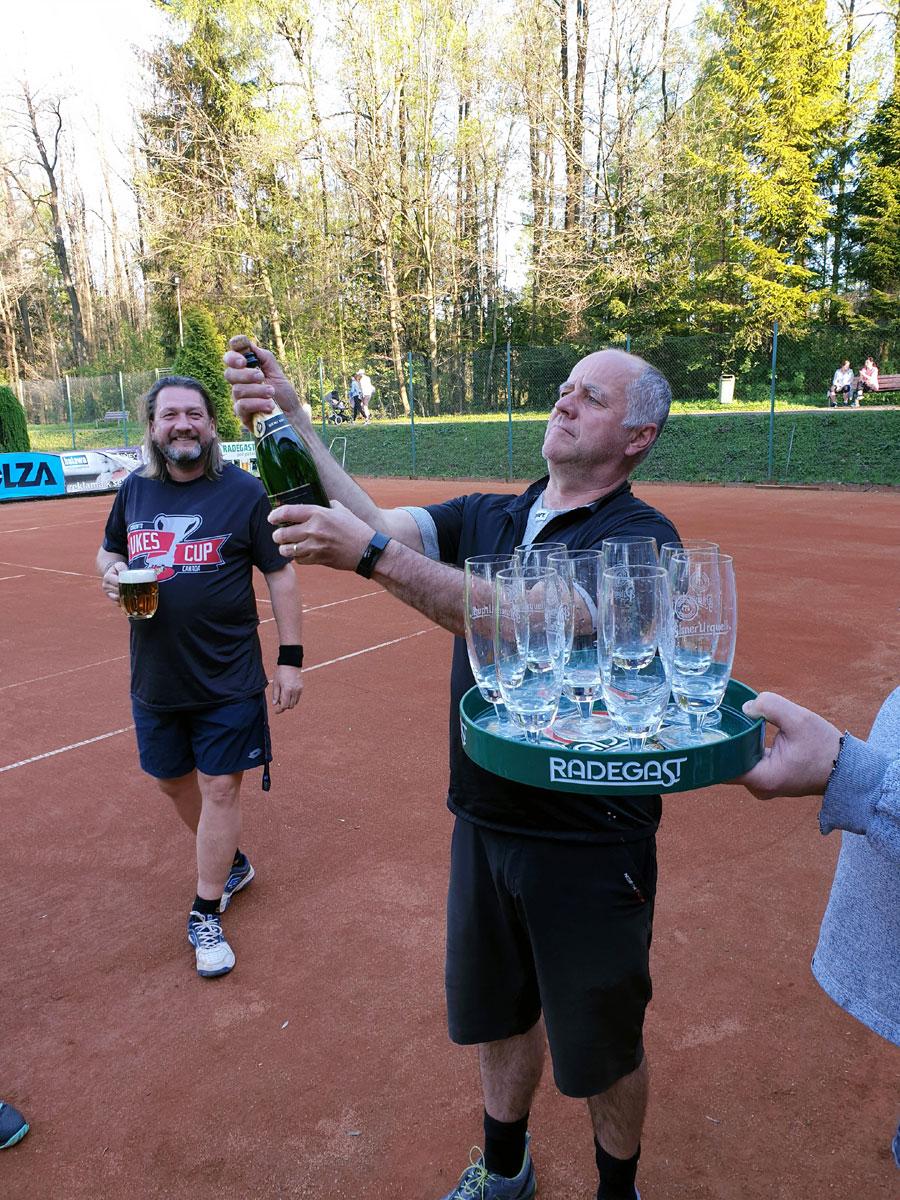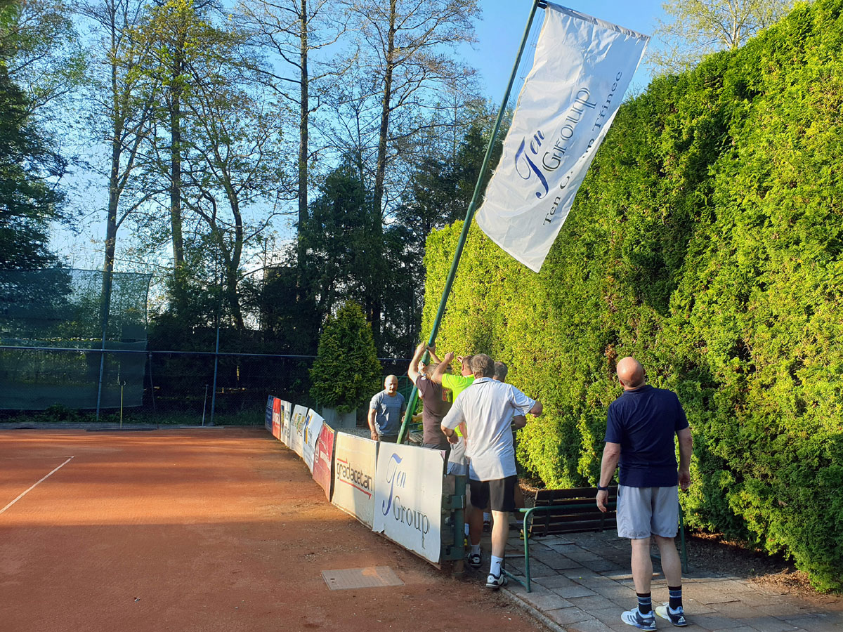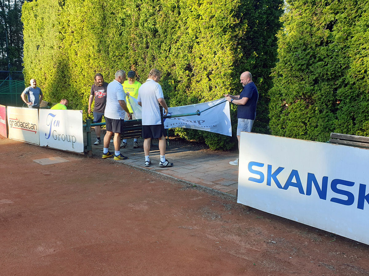 Počasí se umoudřilo a my jsme za sluníčka pověsili klubové vlajky, přiťukli jsme si šampaňským a na centrálním dvorci jsme sehráli přátelské utkání ve čtyřhře se sponzory klubu.