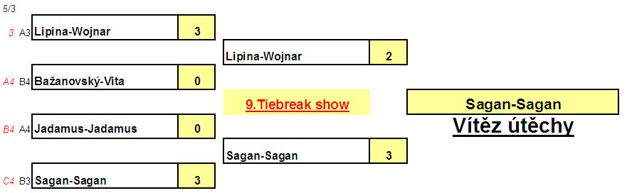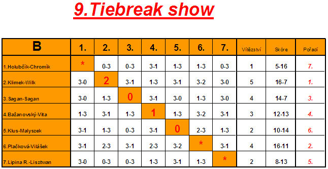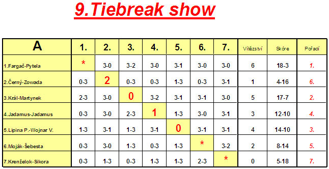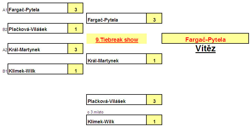 Hrálo se samozřejmě jako každý rok na tři vítězné tie breaky do deseti bodů. Nalosovány byly čtyři skupiny z nichž se postupovalo do finálového pavouka a rovněž do útěchy.