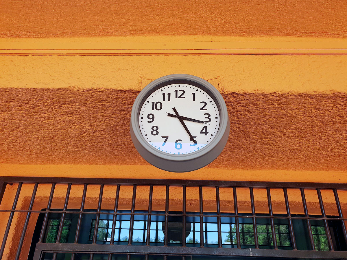 Nové hodiny nad vchodem |
