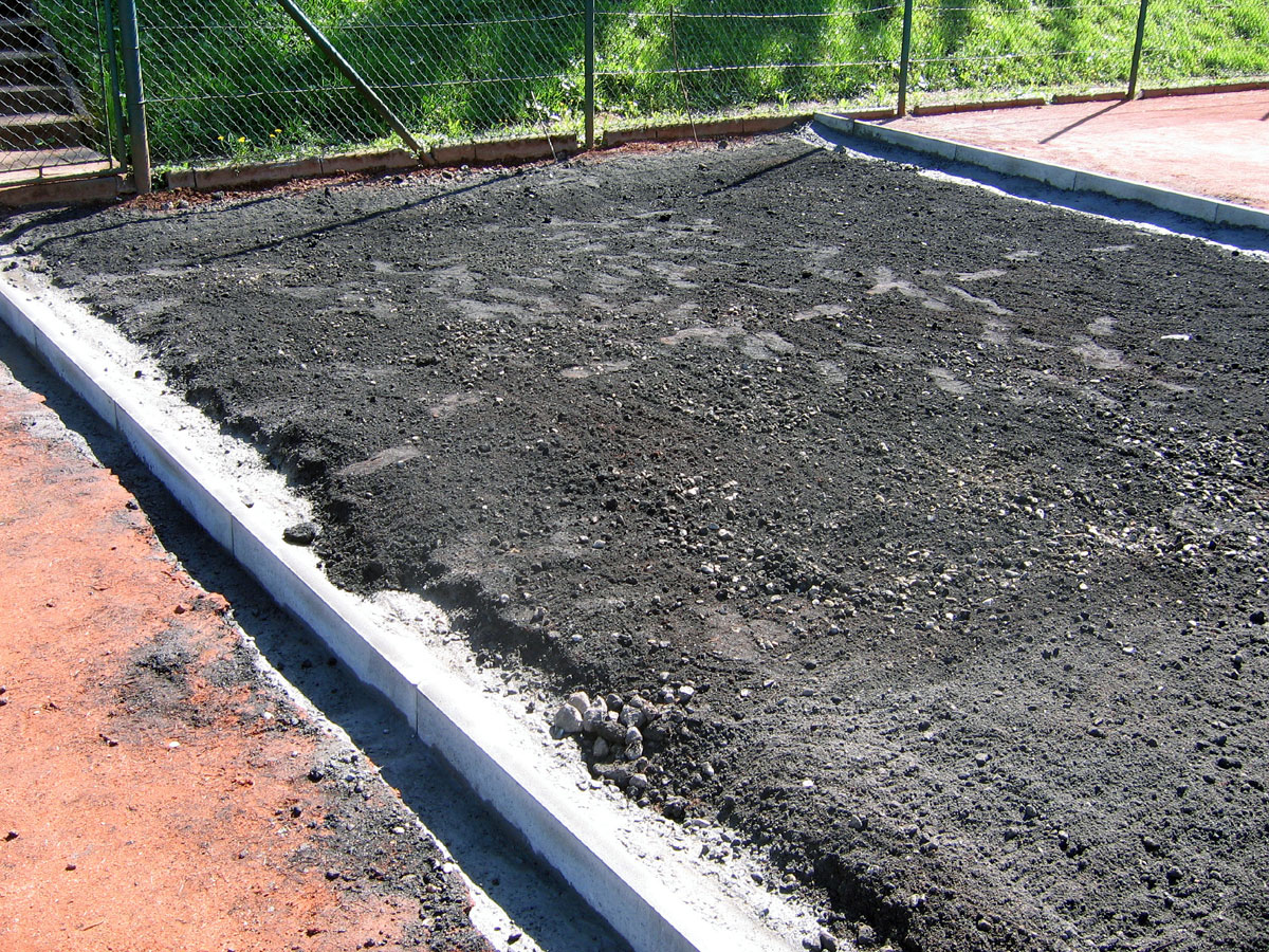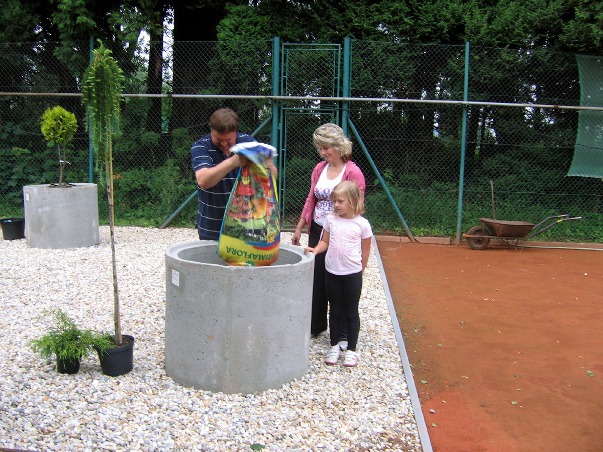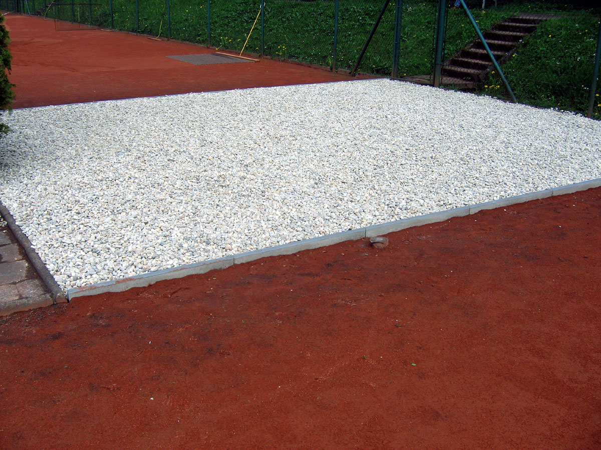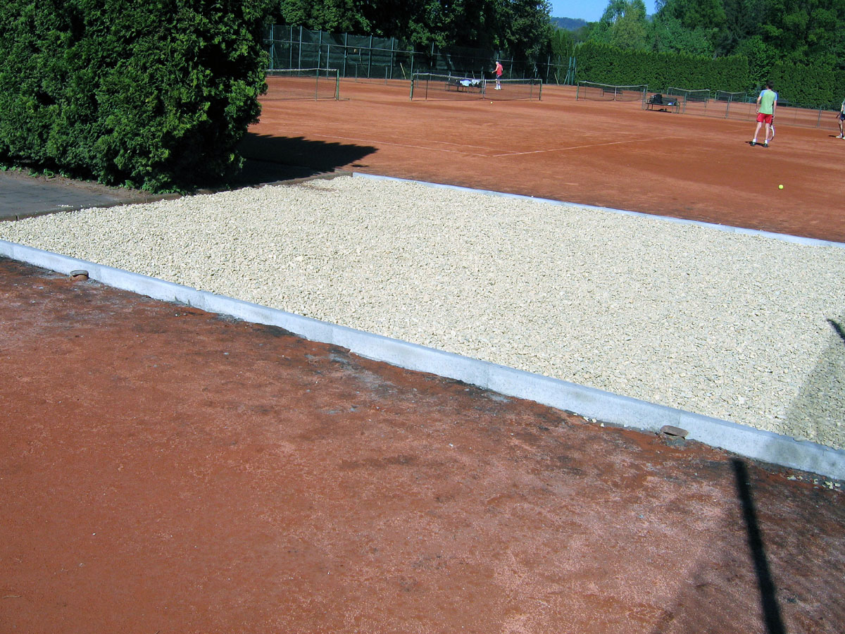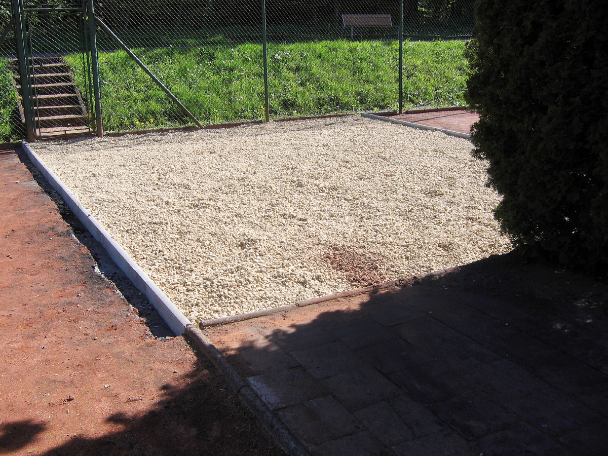 Po několika letech jsme vyřešili problém s prostorem mezi centrálním dvorcem a jedničkou. Neustálé mokro, mech, tráva, plevel a zbytečné množství antuky. To vše jsme vyměnili za nový kařírek. Pod kačírkem je geotextílie a na něm čtyři květináče a v nich nové stromečky. |