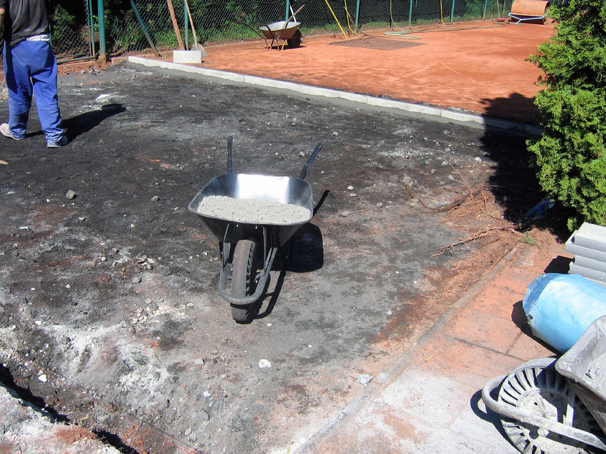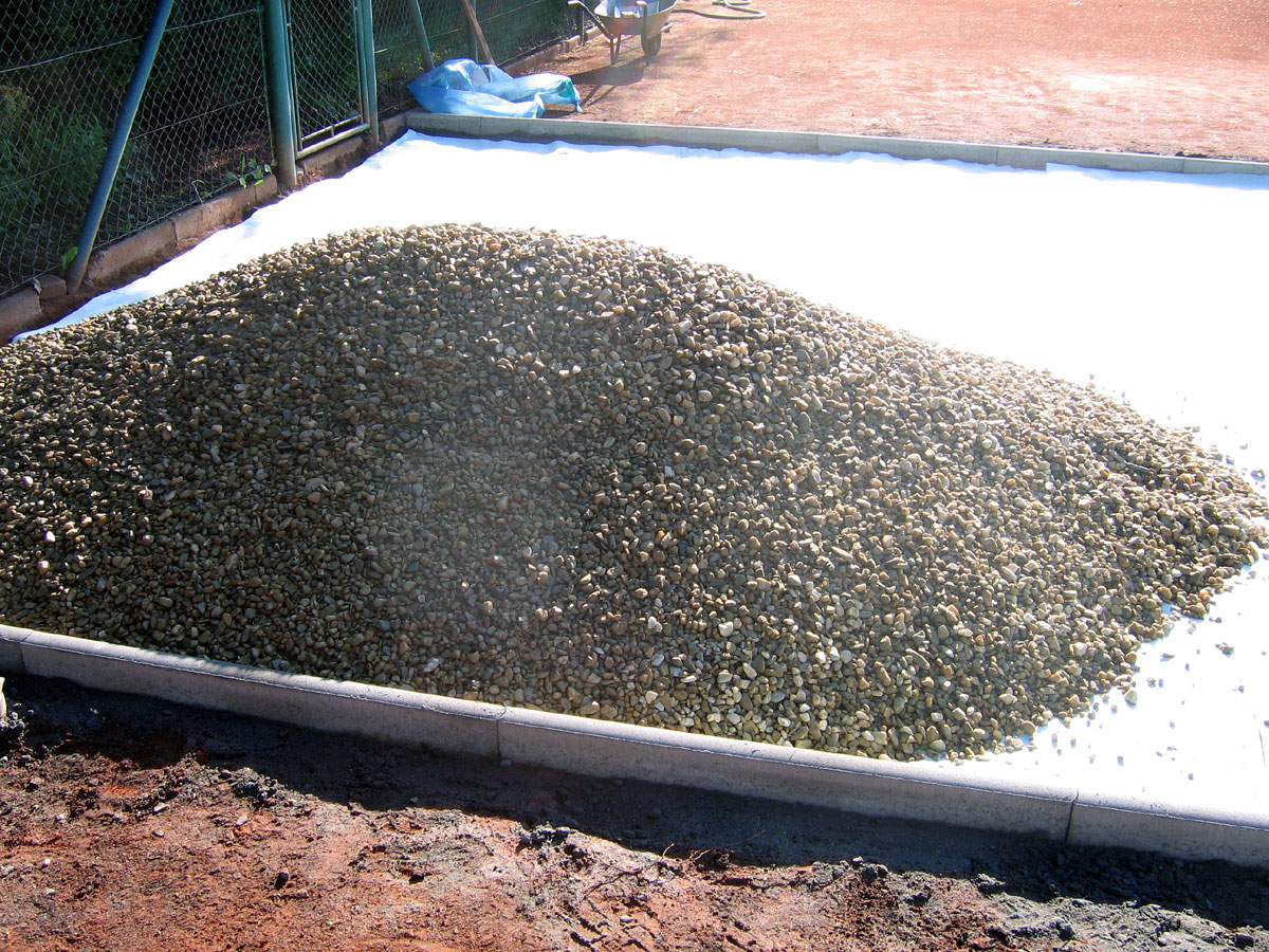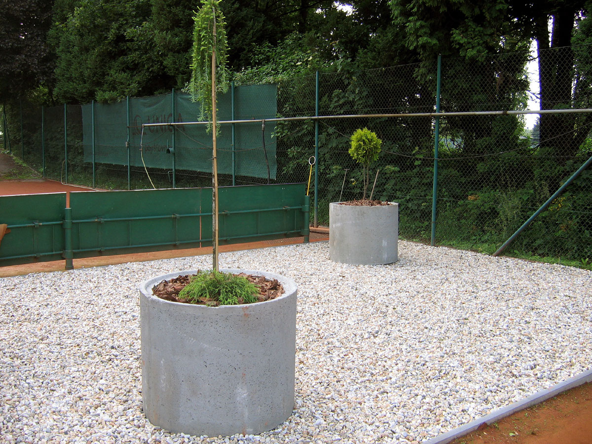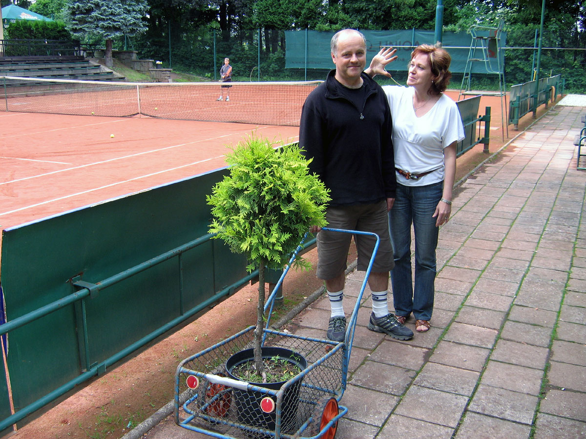 Po několika letech jsme vyřešili problém s prostorem mezi centrálním dvorcem a jedničkou. Neustálé mokro, mech, tráva, plevel a zbytečné množství antuky. To vše jsme vyměnili za nový kařírek. Pod kačírkem je geotextílie a na něm čtyři květináče a v nich nové stromečky. |