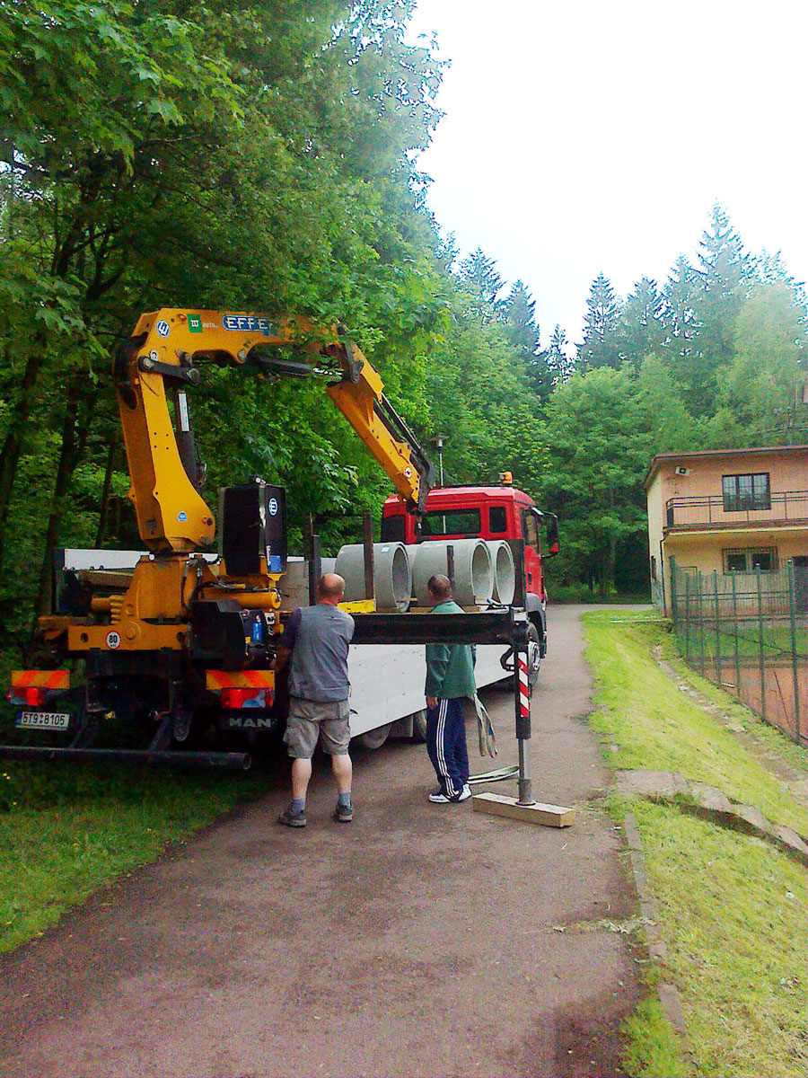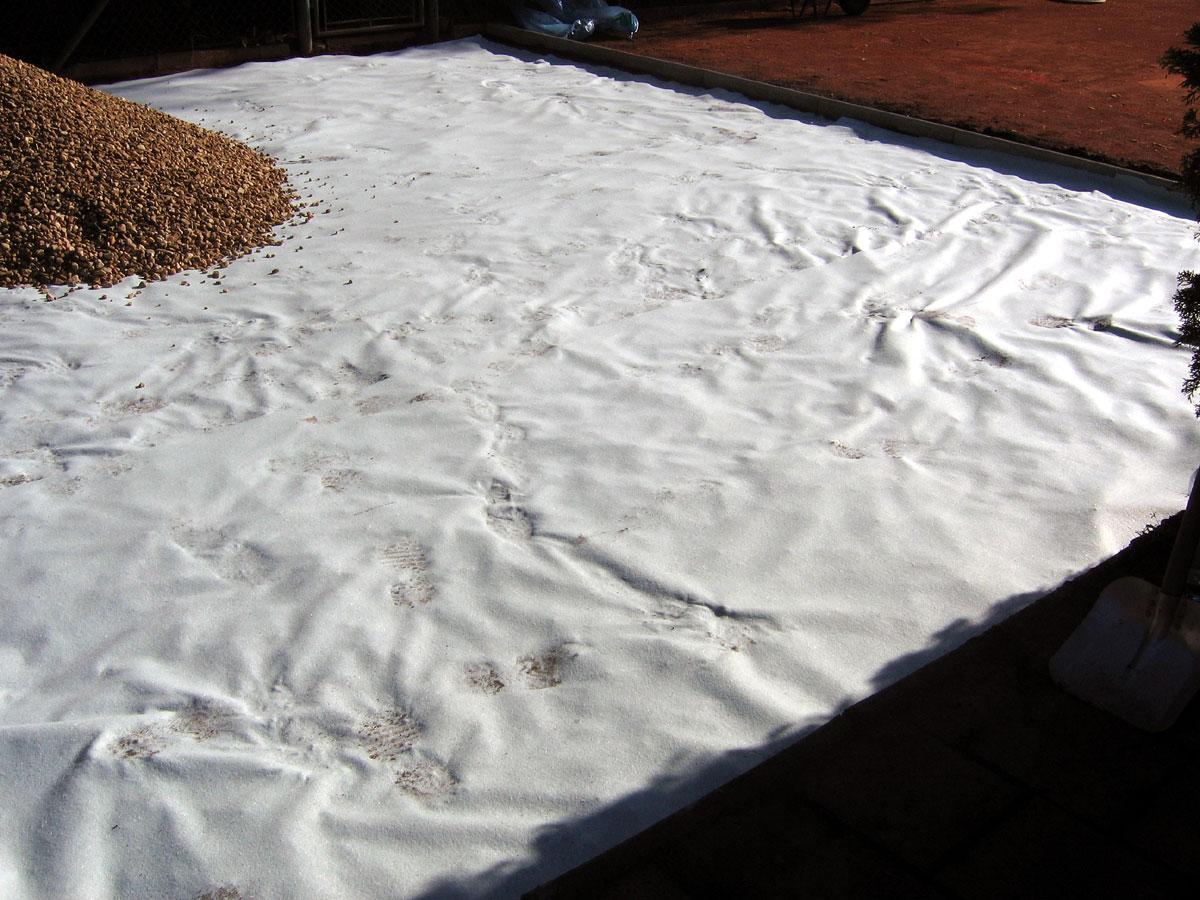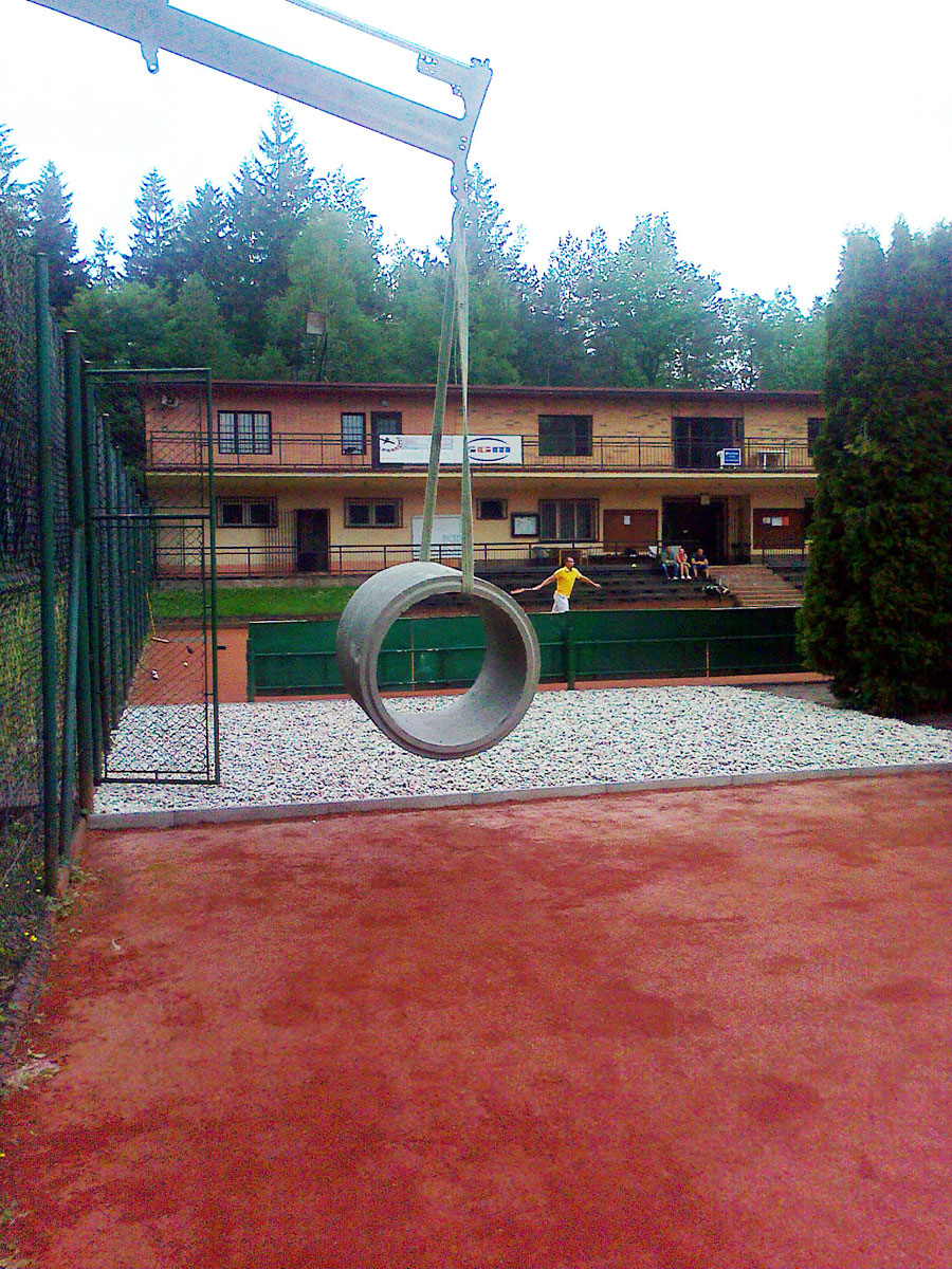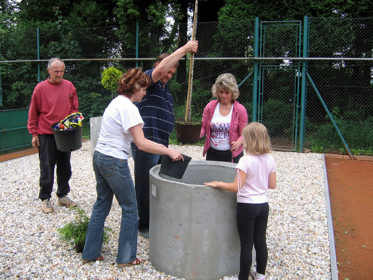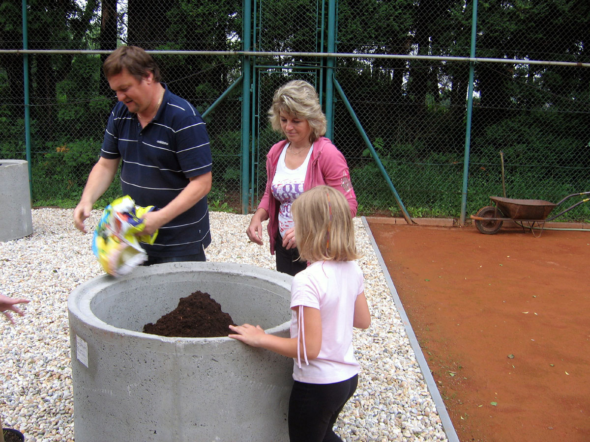 Po několika letech jsme vyřešili problém s prostorem mezi centrálním dvorcem a jedničkou. Neustálé mokro, mech, tráva, plevel a zbytečné množství antuky. To vše jsme vyměnili za nový kařírek. Pod kačírkem je geotextílie a na něm čtyři květináče a v nich nové stromečky. |