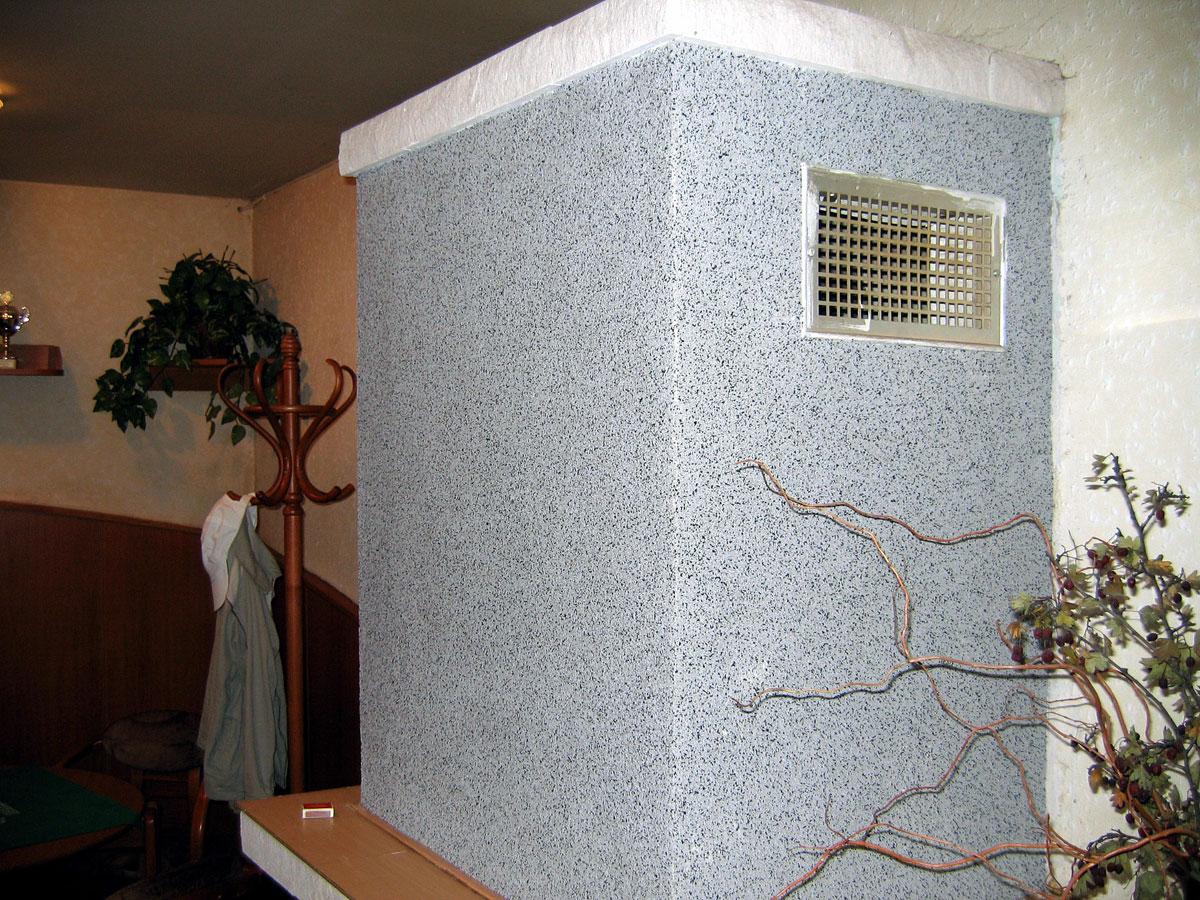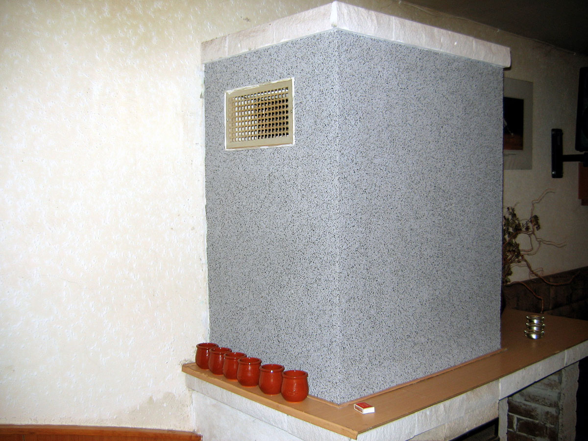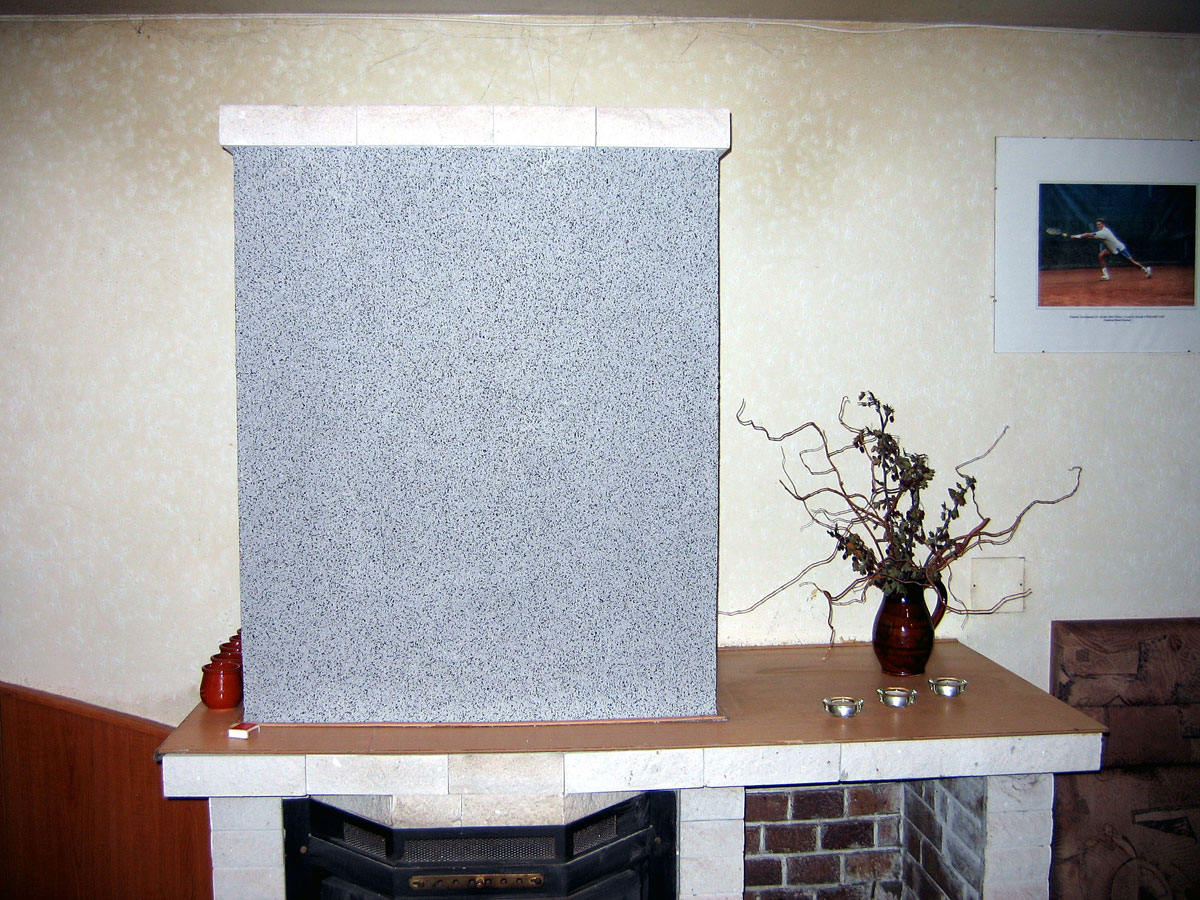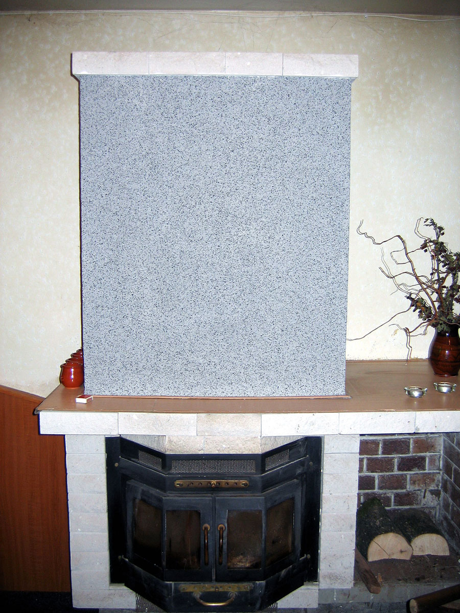 Neustále praskání omítky na krbu nás přimělo natáhnout na něho pružnou hmotu "Marmolit". Také jsme opravily obkladové kachličky. |