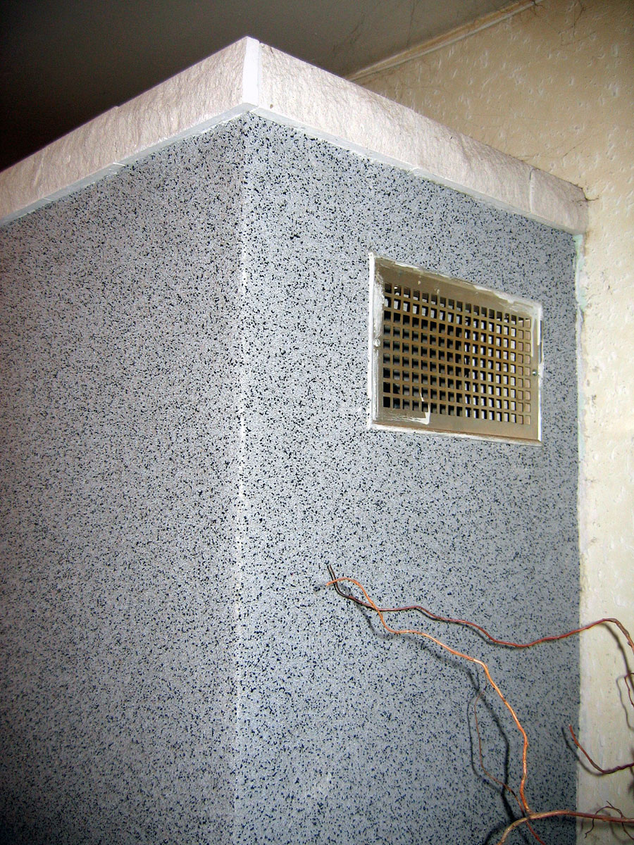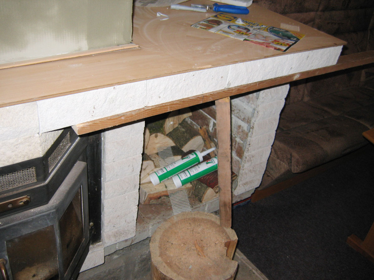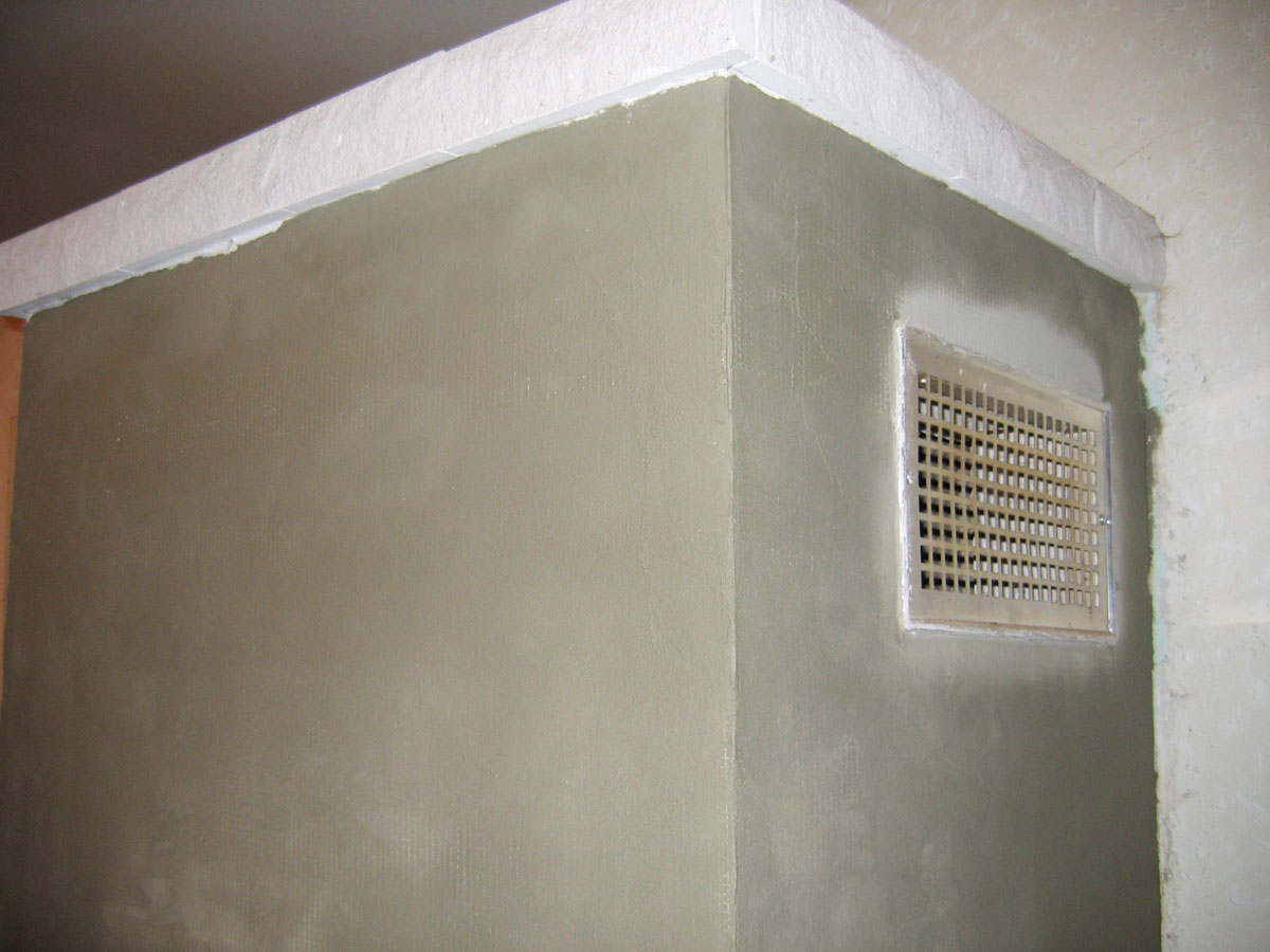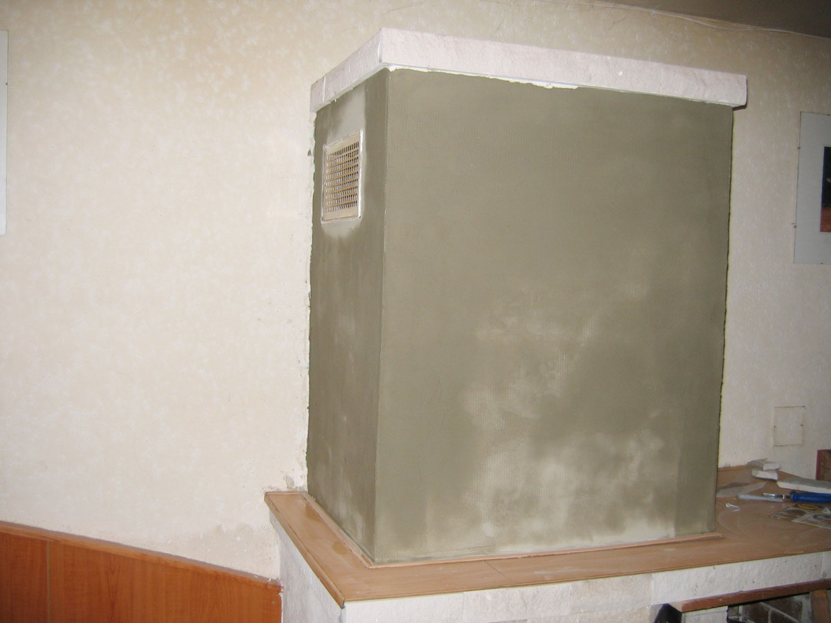 Neustále praskání omítky na krbu nás přimělo natáhnout na něho pružnou hmotu "Marmolit". Také jsme opravily obkladové kachličky. |