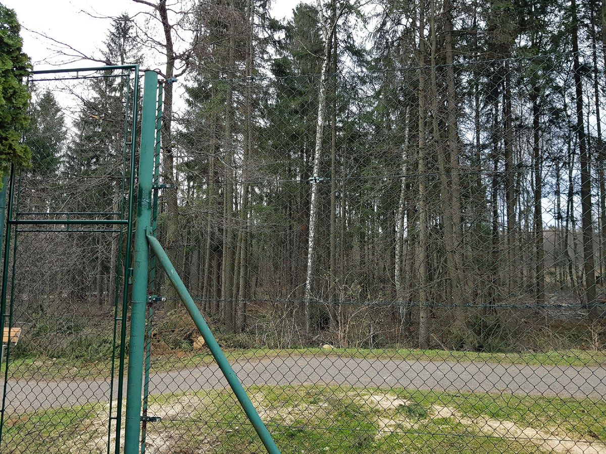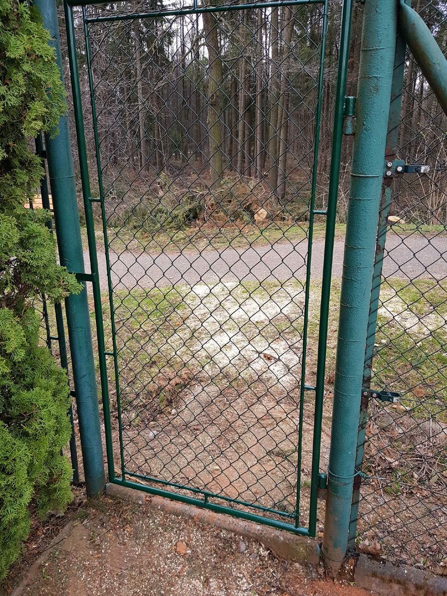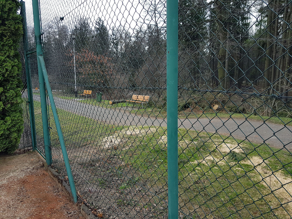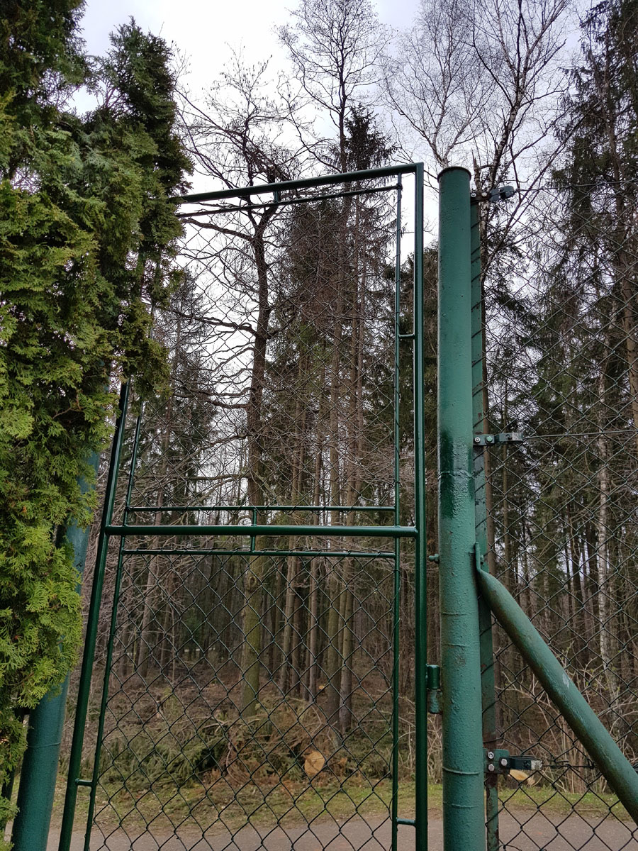 No a třetí v pořadí odstraňování kod je po pádu stromu poničené oplocení a vstupní branka na dvorci č.5. Spadlé tři stromy ve vánočním období minulého roku pokodily tři pole oplocení a zlomily vstupní branku na dvorec. Do třetice jsme se mohli spolehnout na firmu Miloe Jadamuse, která provedla perfektní opravu. |