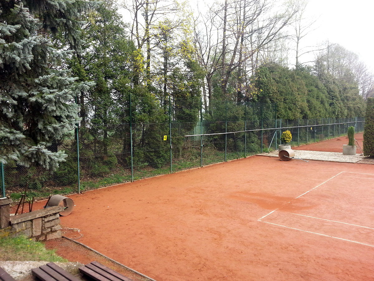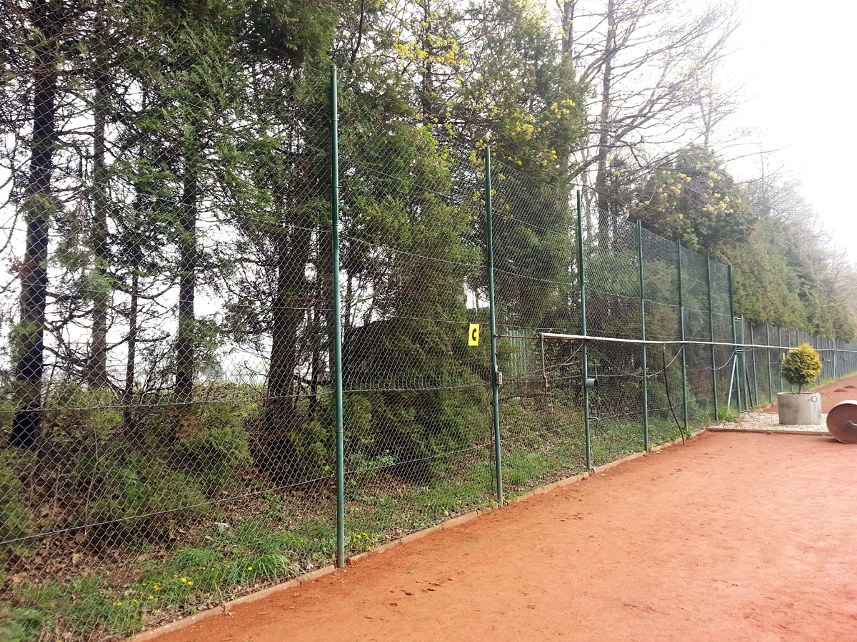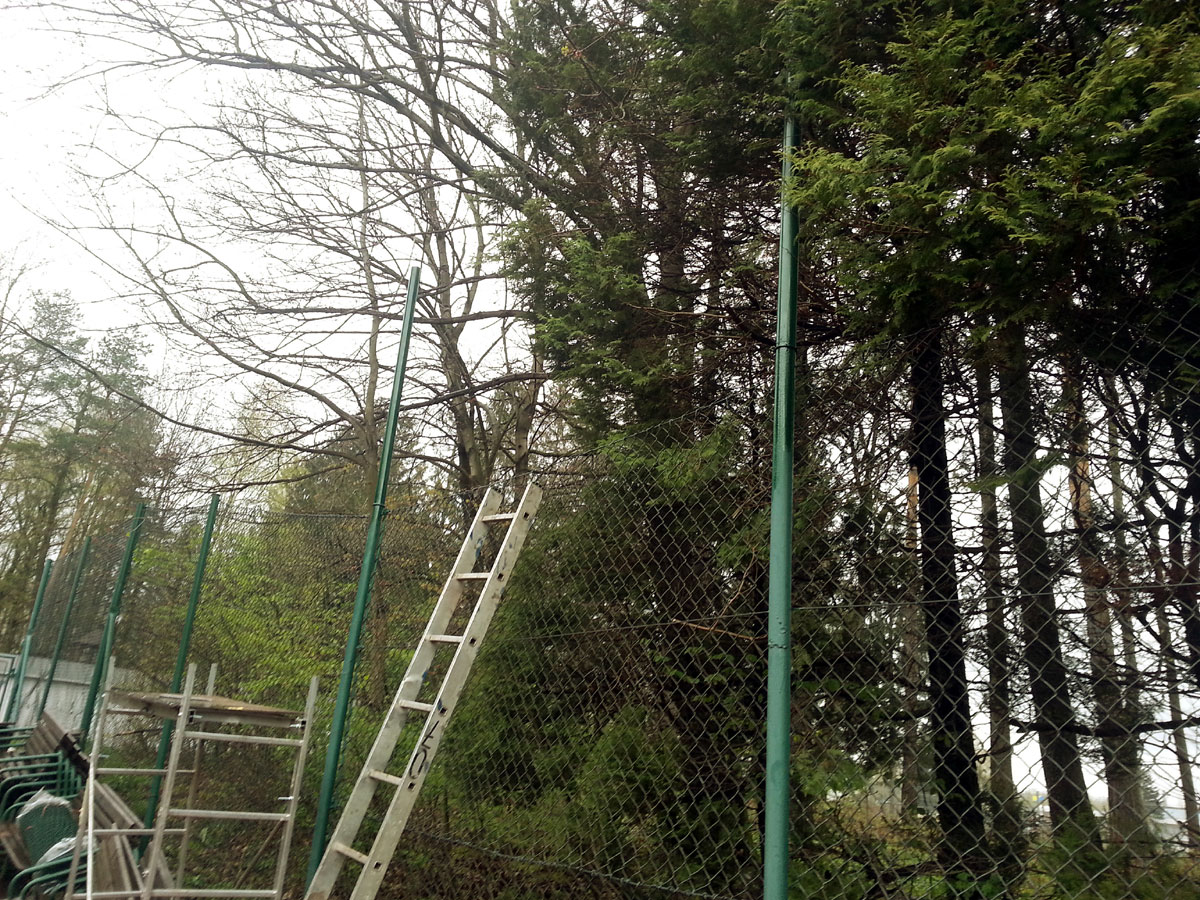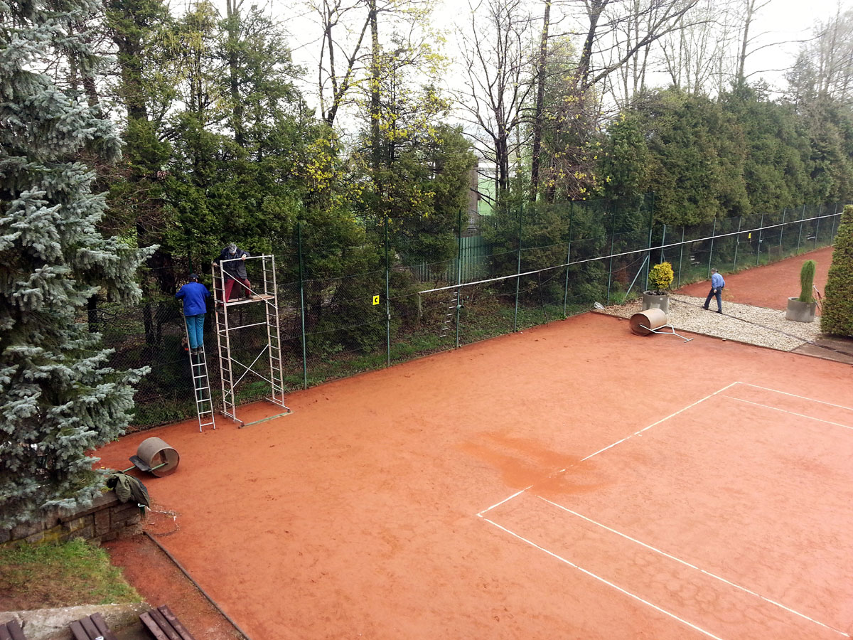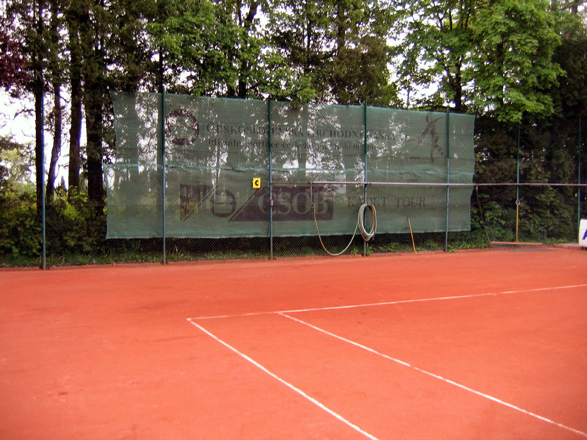 Pro zamezení létání míčků za plot a zlepšení viditelnosti jsme nadstavili plot na centrálním dvorci a napnuli na něm plachty, které zamezily průniku světla přes vysekané části lesa. |