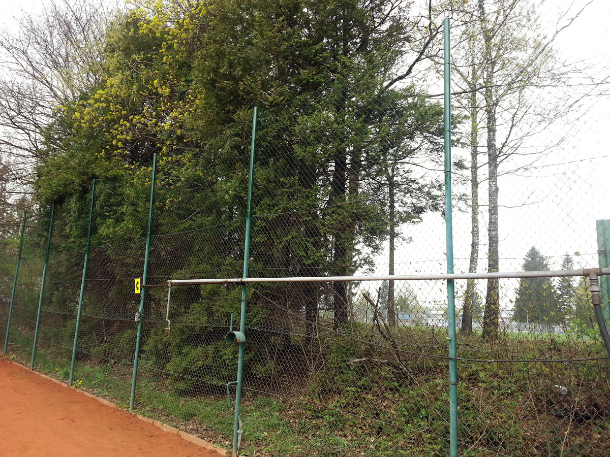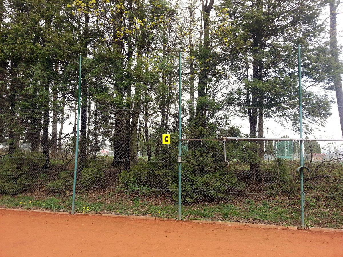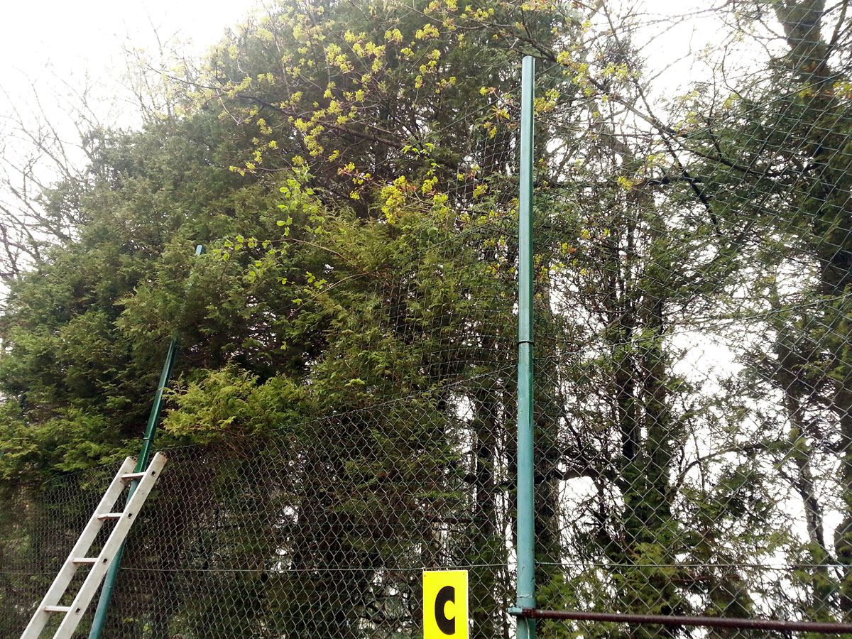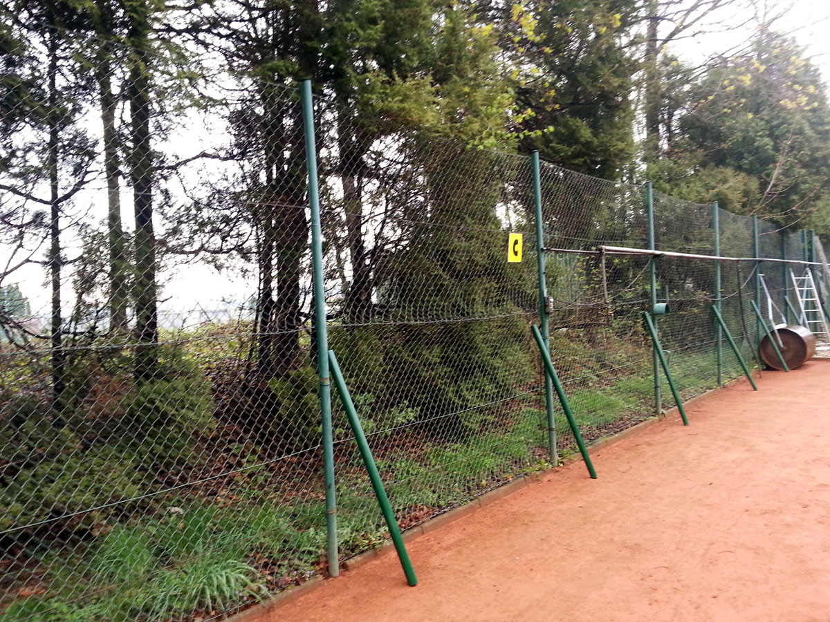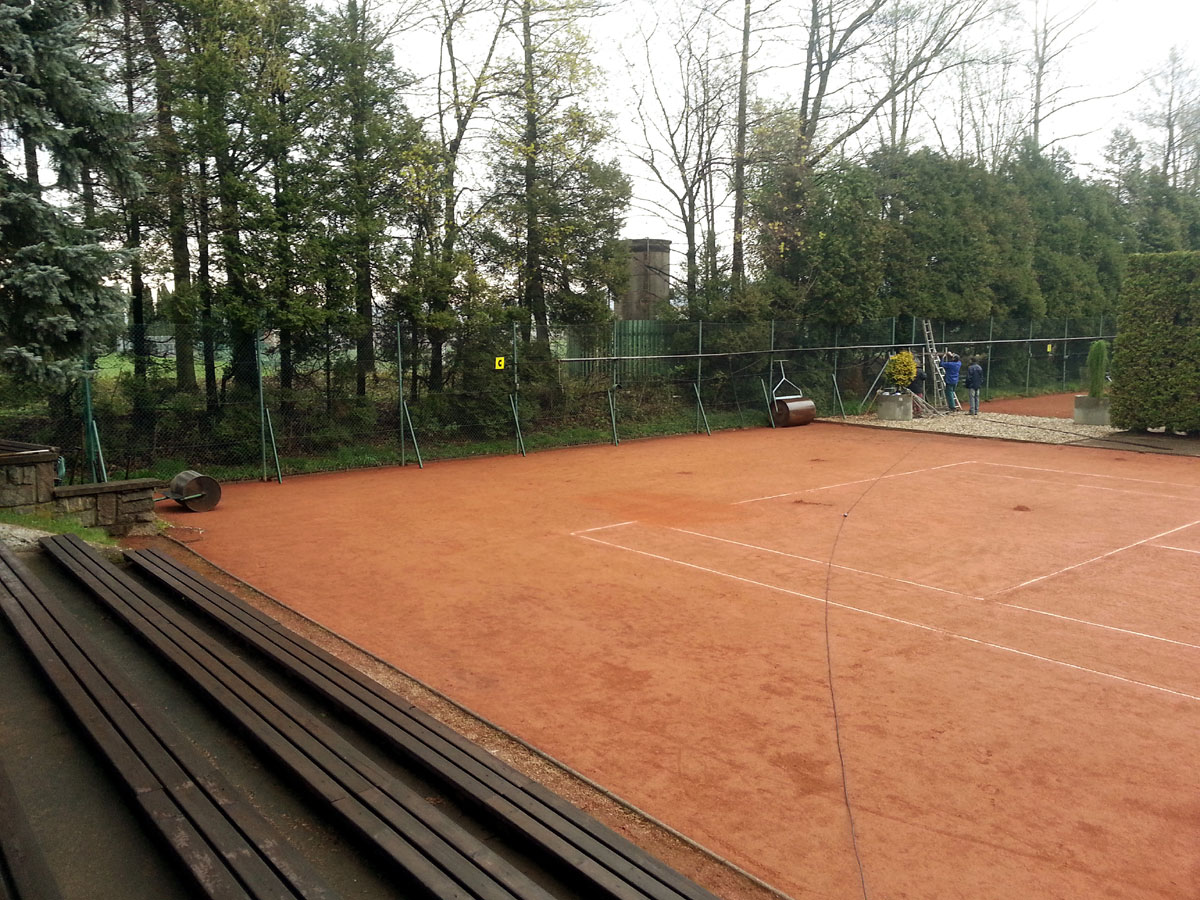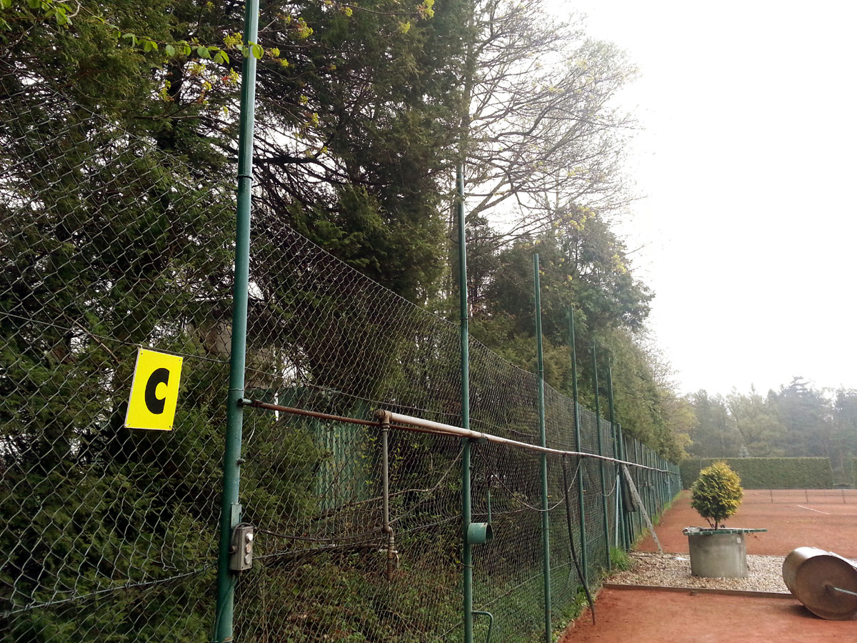Pro zamezení létání míčků za plot a zlepšení viditelnosti jsme nadstavili plot na centrálním dvorci a napnuli na něm plachty, které zamezily průniku světla přes vysekané části lesa. |