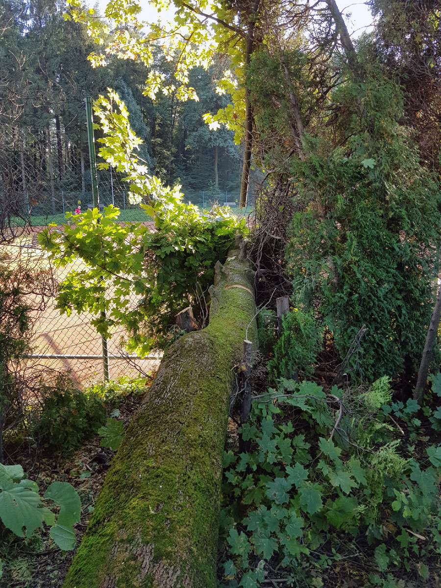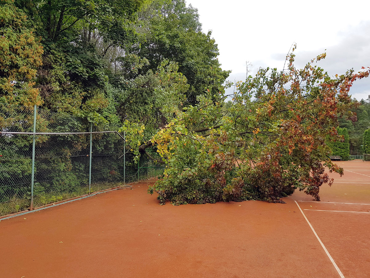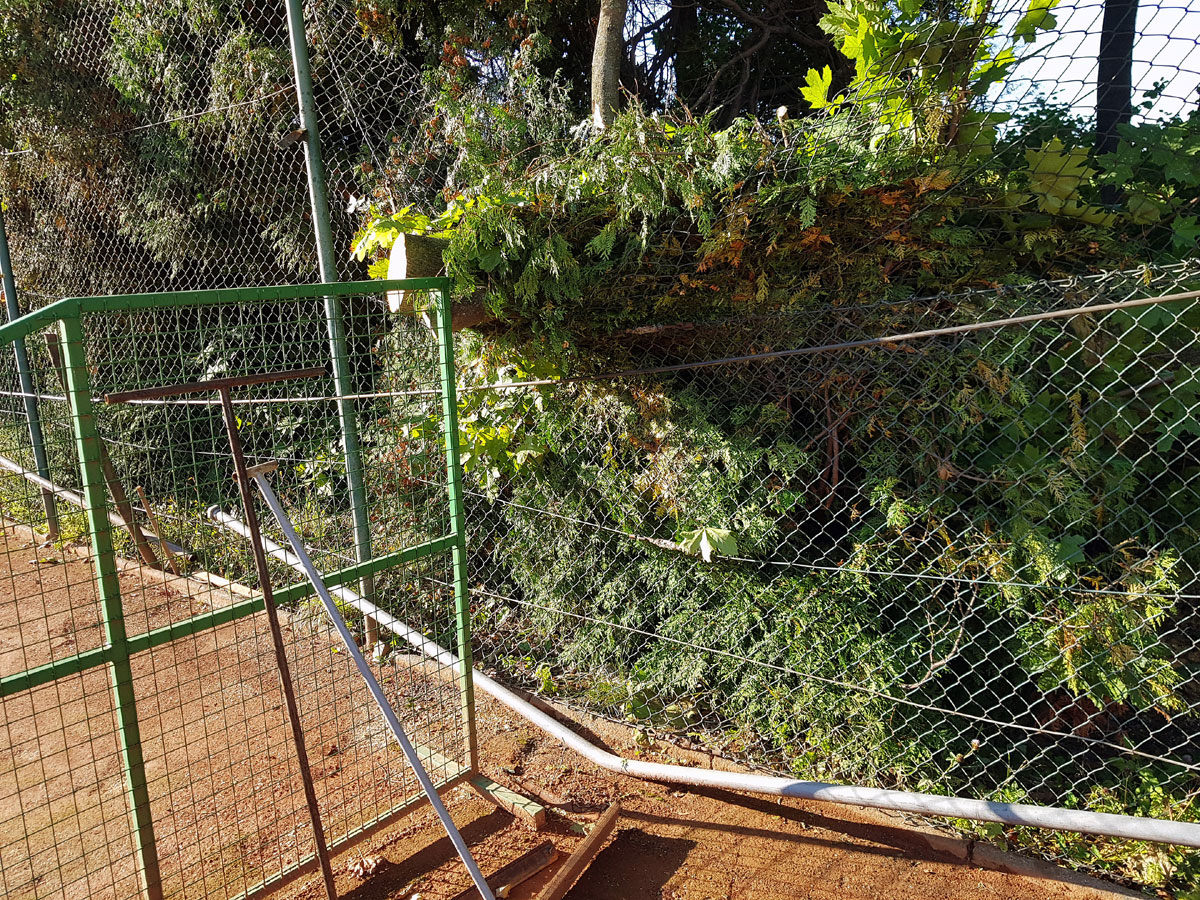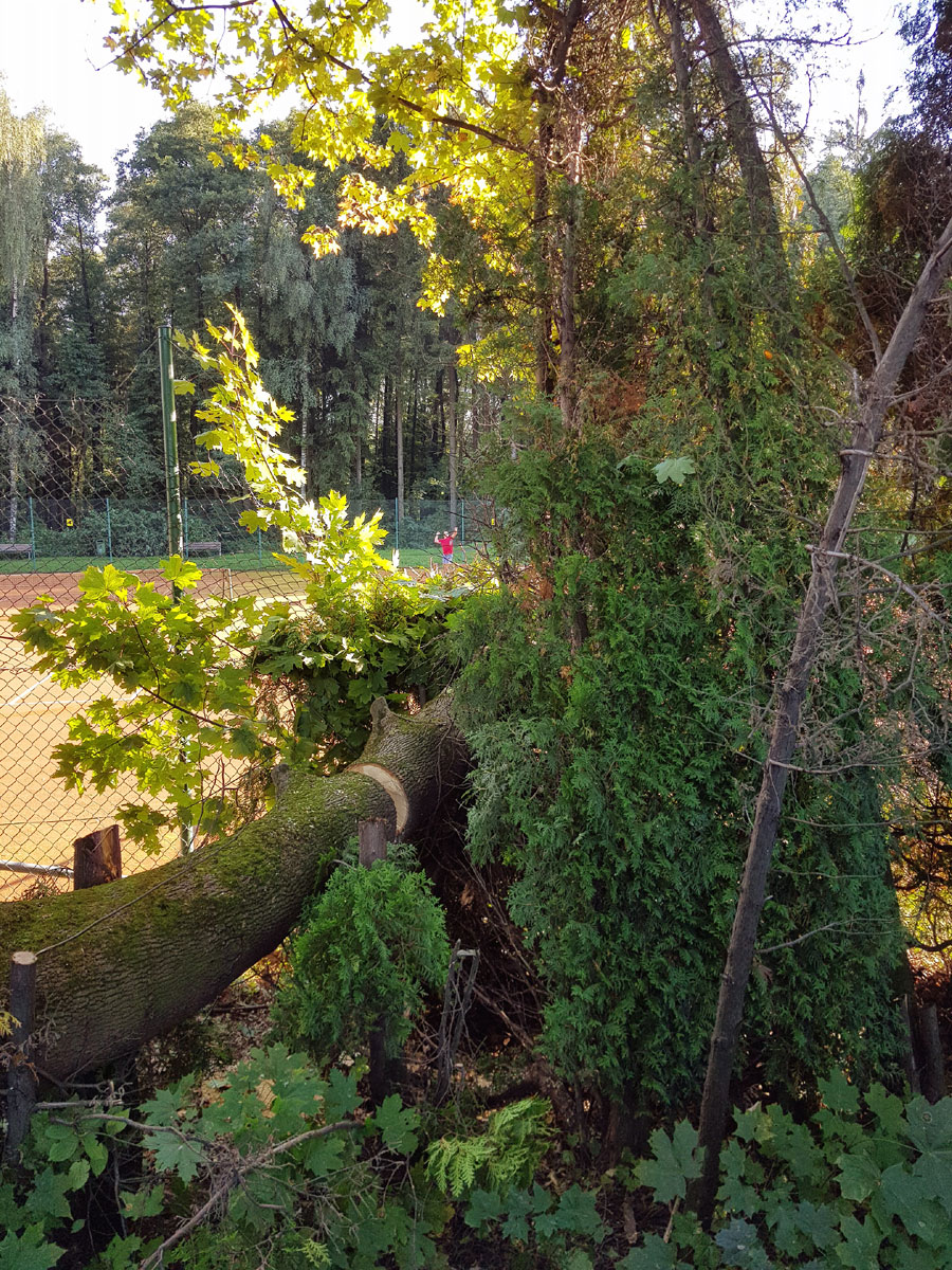 A máme tu další pád stromu. Tentokrát spadl vysoký strom v silném větru 14.09.2017 ze strany hřiště a zničil nám tři pole plotu a také rozvody vody, sloužící na postřik dvorců. Strom jsme nařezali ve složení René Fargač, Aleš Dobesch a správce Zdeněk Sikora. Ještě že při pádu nikdo nebyl na dvorci. Teď už to musíme jen opravit. |