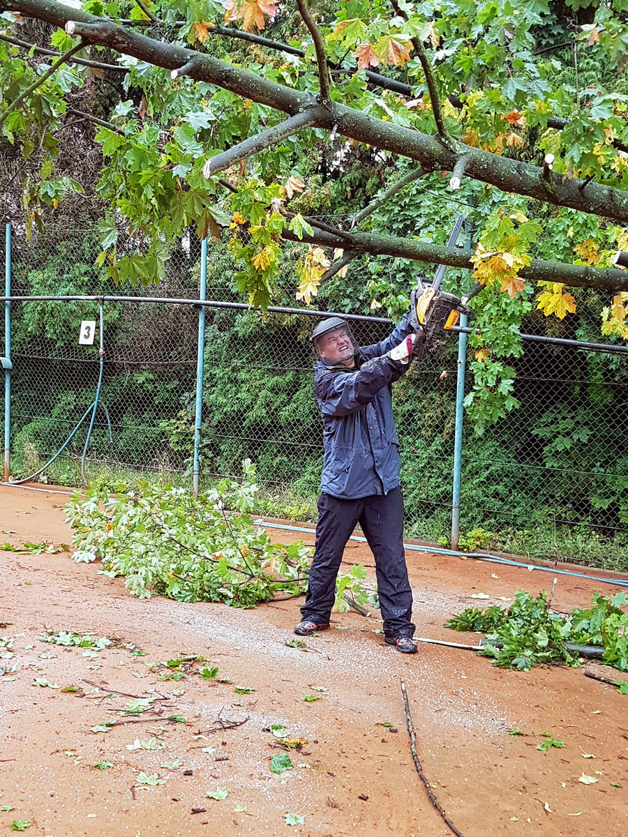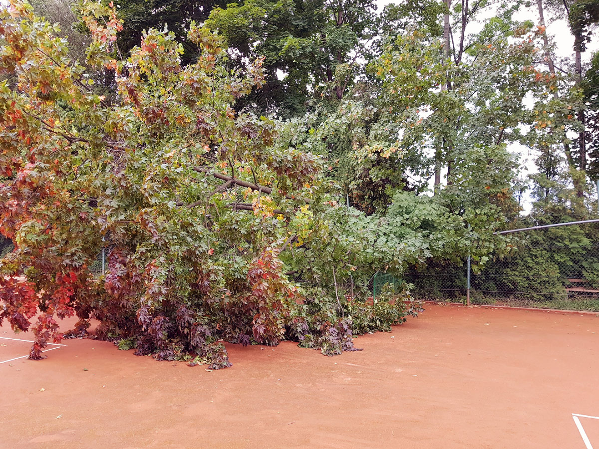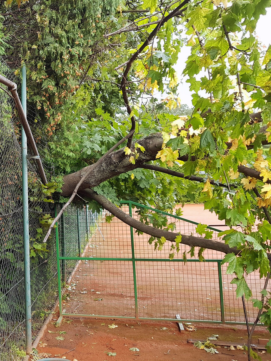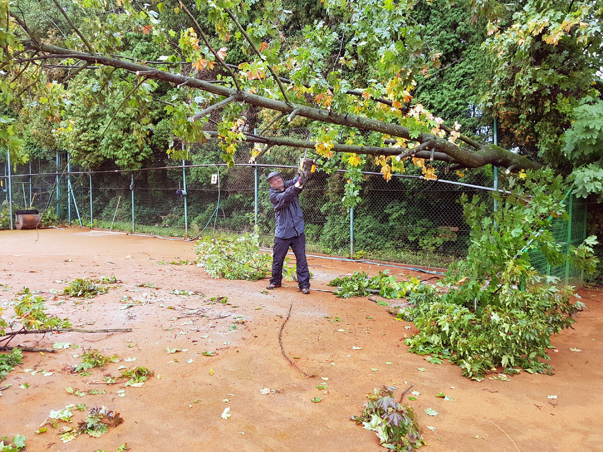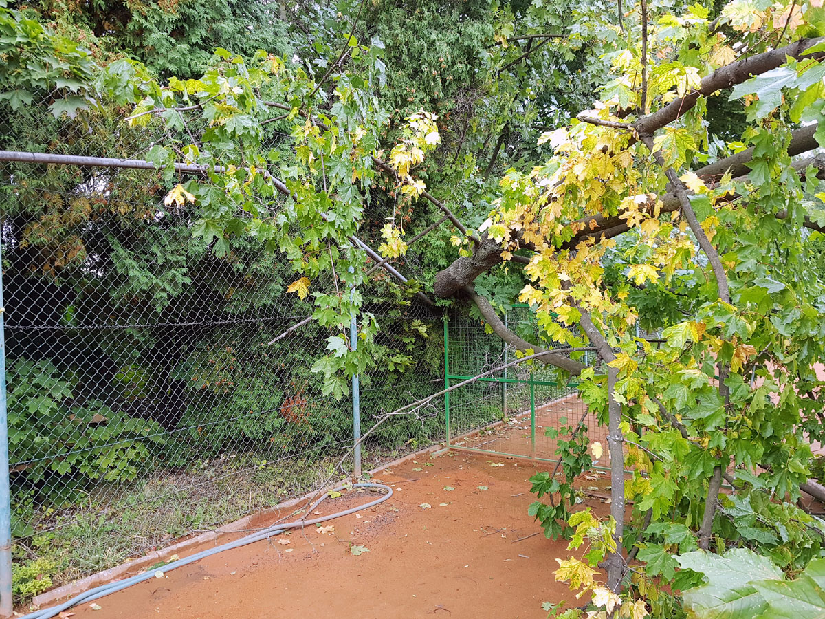 A máme tu další pád stromu. Tentokrát spadl vysoký strom v silném větru 14.09.2017 ze strany hřiště a zničil nám tři pole plotu a také rozvody vody, sloužící na postřik dvorců. Strom jsme nařezali ve složení René Fargač, Aleš Dobesch a správce Zdeněk Sikora. Ještě že při pádu nikdo nebyl na dvorci. Teď už to musíme jen opravit. |
