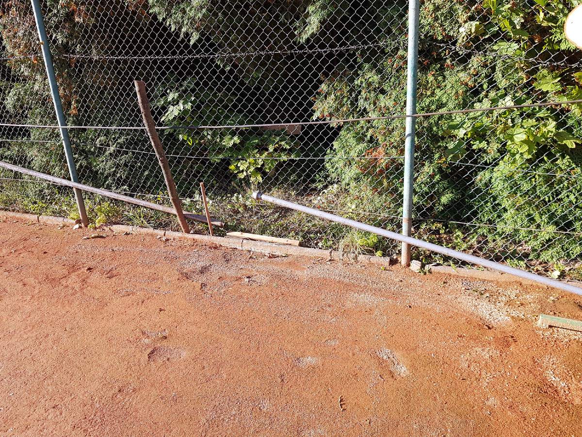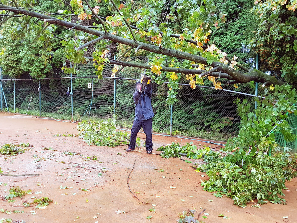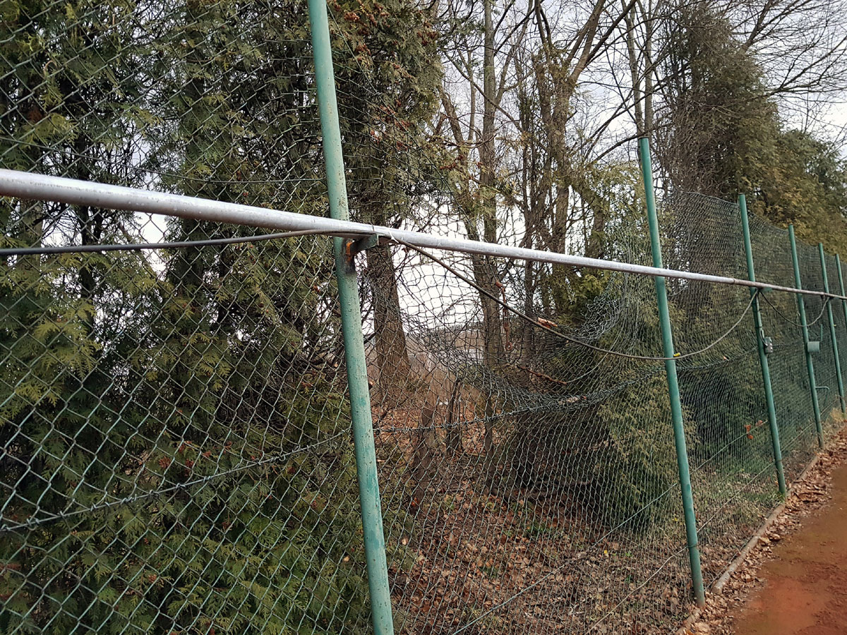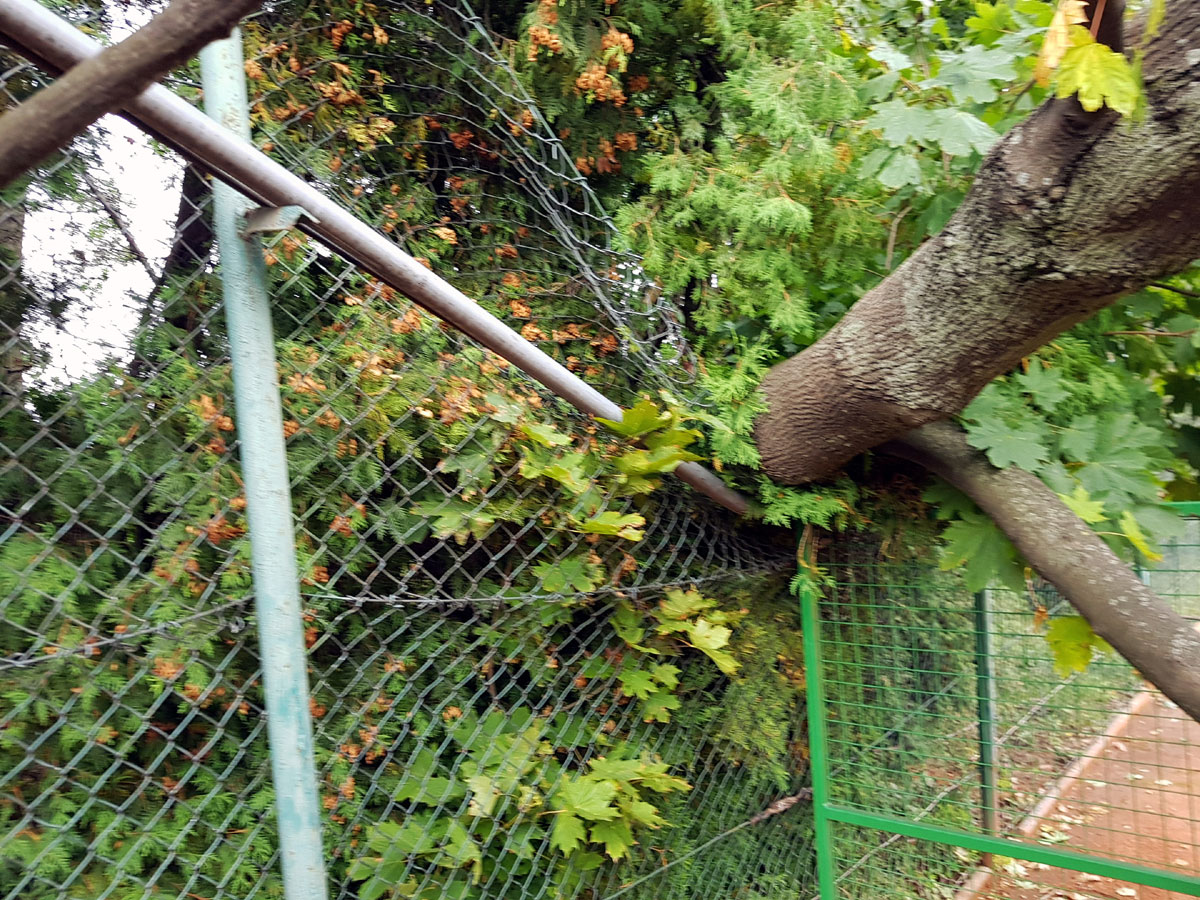 A máme tu další pád stromu. Tentokrát spadl vysoký strom v silném větru 14.09.2017 ze strany hřiště a zničil nám tři pole plotu a také rozvody vody, sloužící na postřik dvorců. Strom jsme nařezali ve složení René Fargač, Aleš Dobesch a správce Zdeněk Sikora. Ještě že při pádu nikdo nebyl na dvorci. Teď už to musíme jen opravit. |