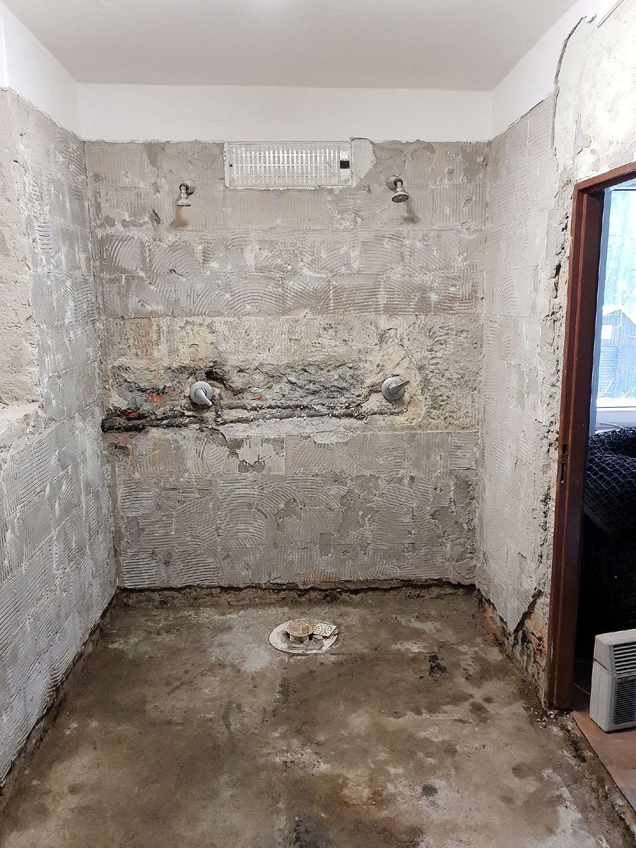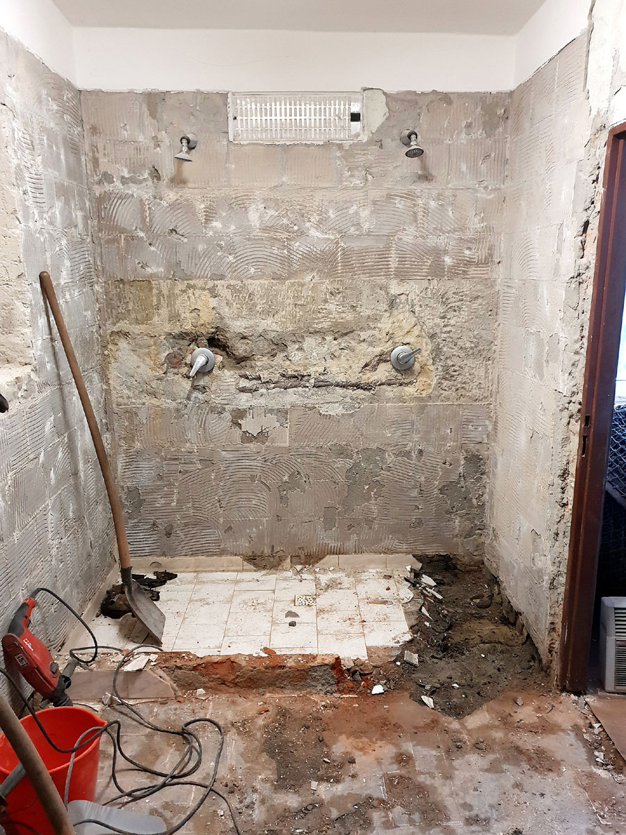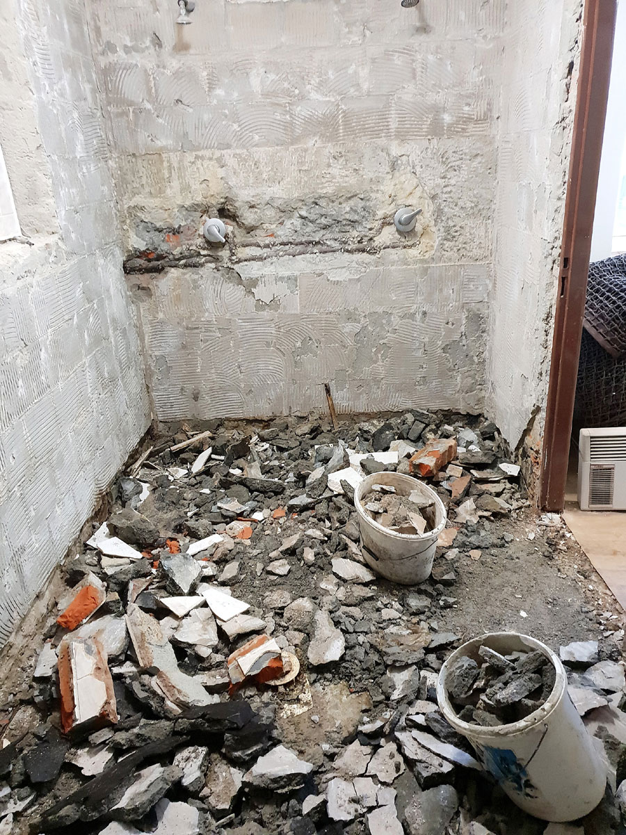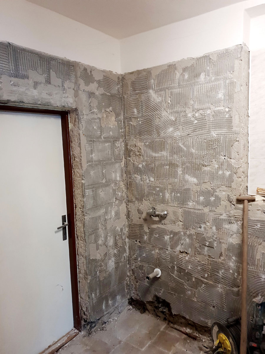 Jako první přišly na řadu bourací práce, kdy bylo třeba sundat staré obklady a dlažby, vybourat podlahu a demontovat staré rozvody vody a zdravotechniku. Fotky z bouracích prací najdete níže. |