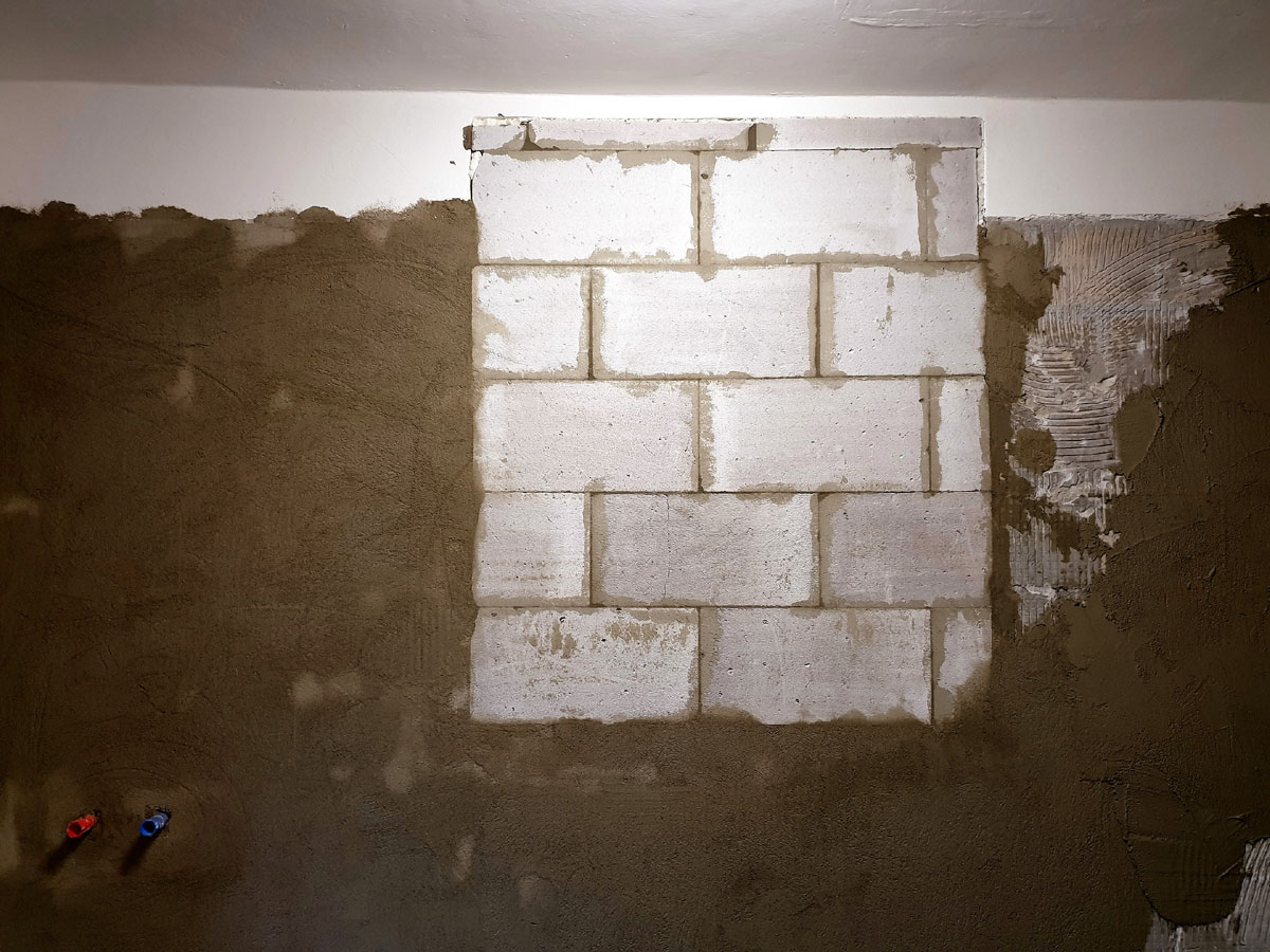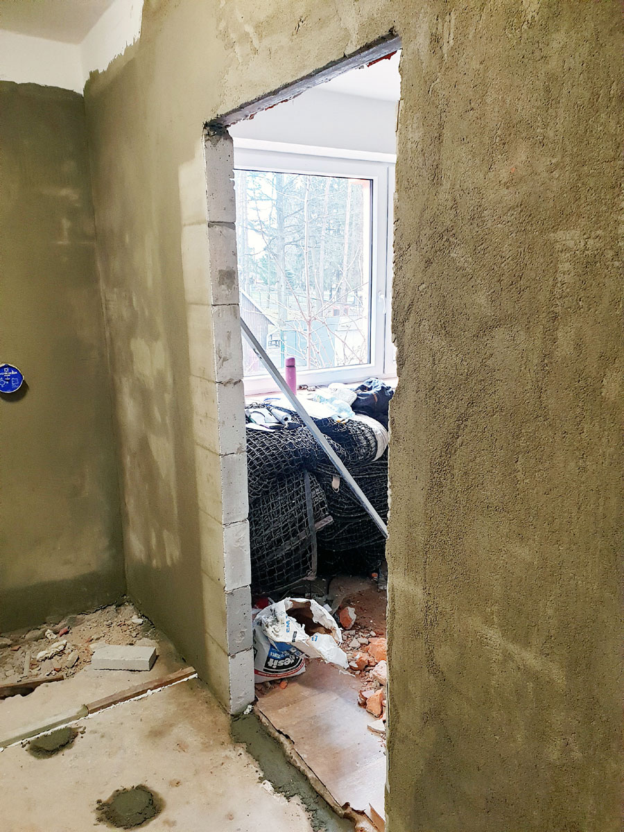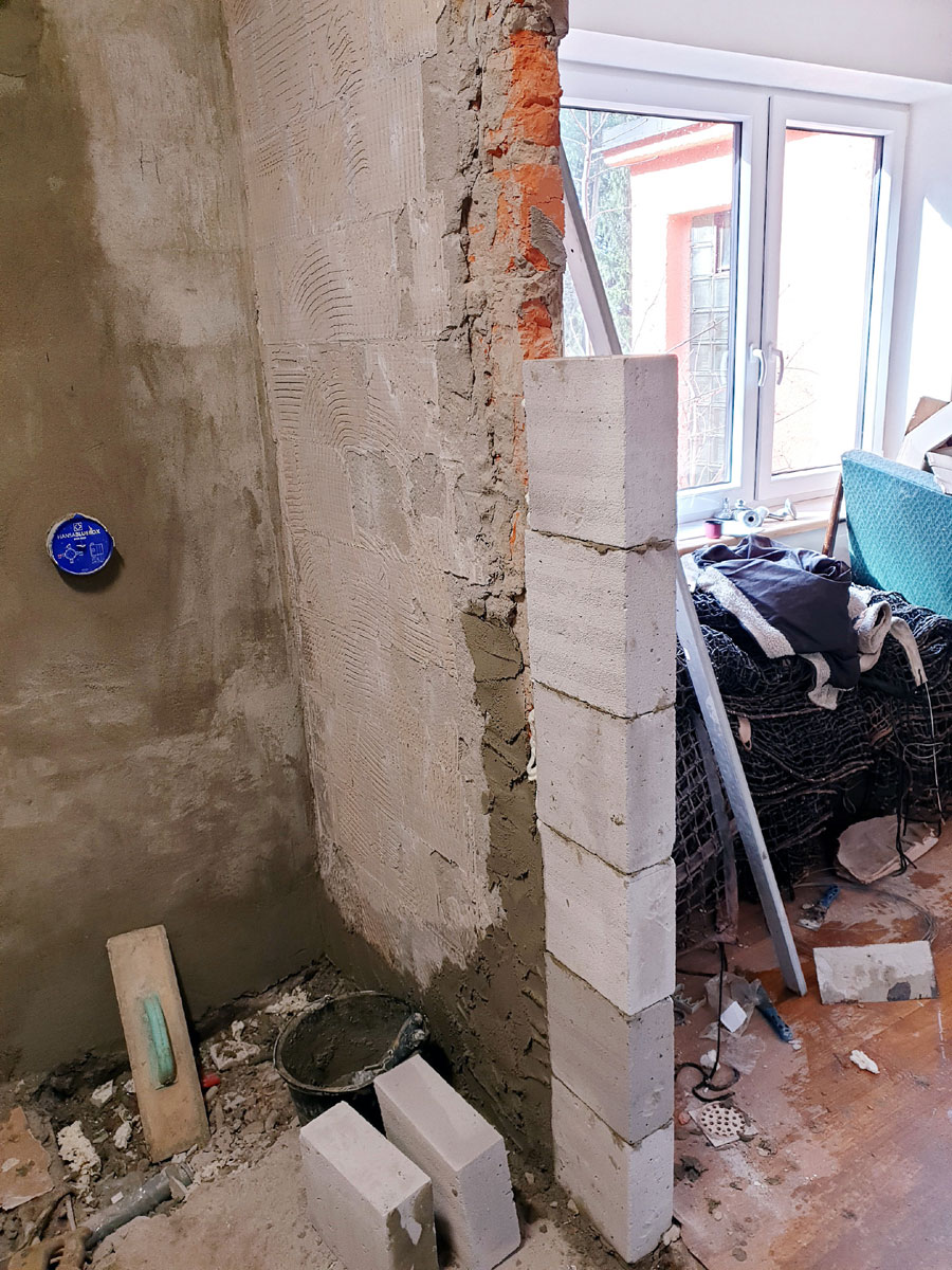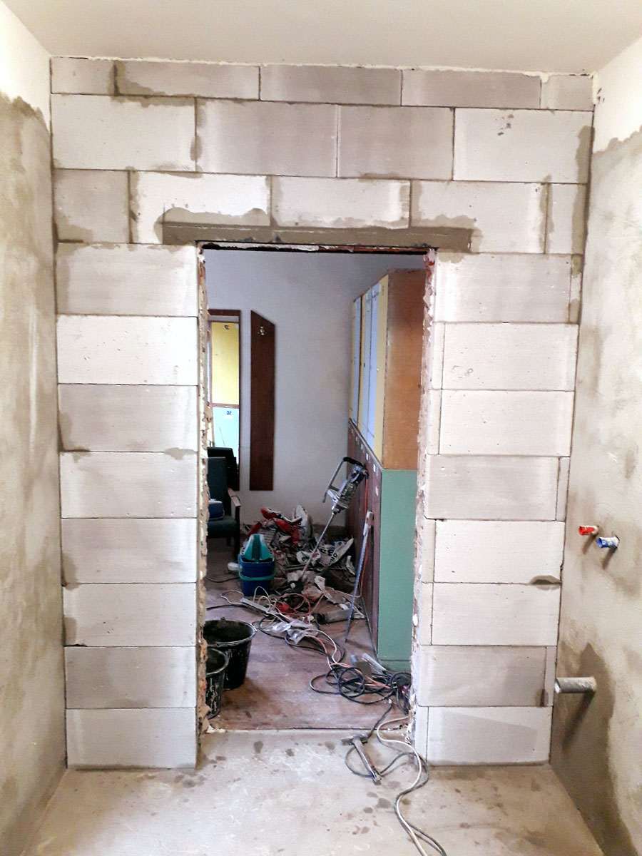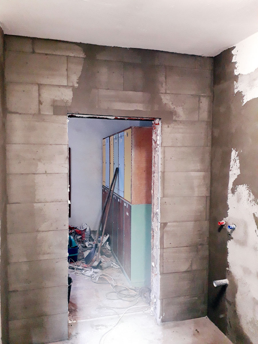 Po instalacích rozvodů jsme se věnovali otvorům do sprch. Proběhl přesun a oprava otvorů pro nové dveře a zazdění jednoho přebytečného výklenku. Vše je na připojených fotkách. |