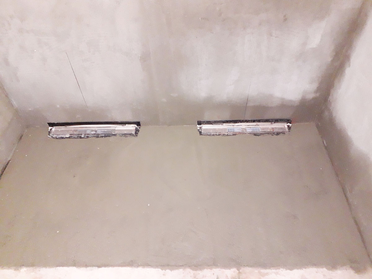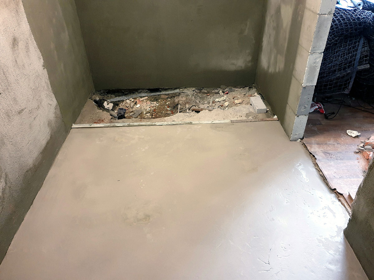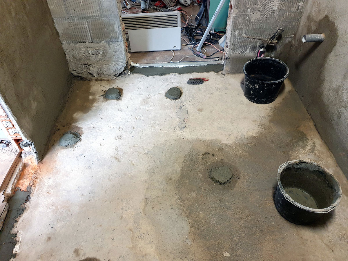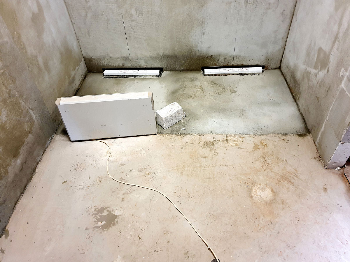 No a po přípravě otvorů přišla na řadu podlaha. Provedli jsme novou podlahu celé sprchy s instalovanými žlaby pro odvod vody ze sprch. Na podlahu se můžete podívat na následujících fotkách. |