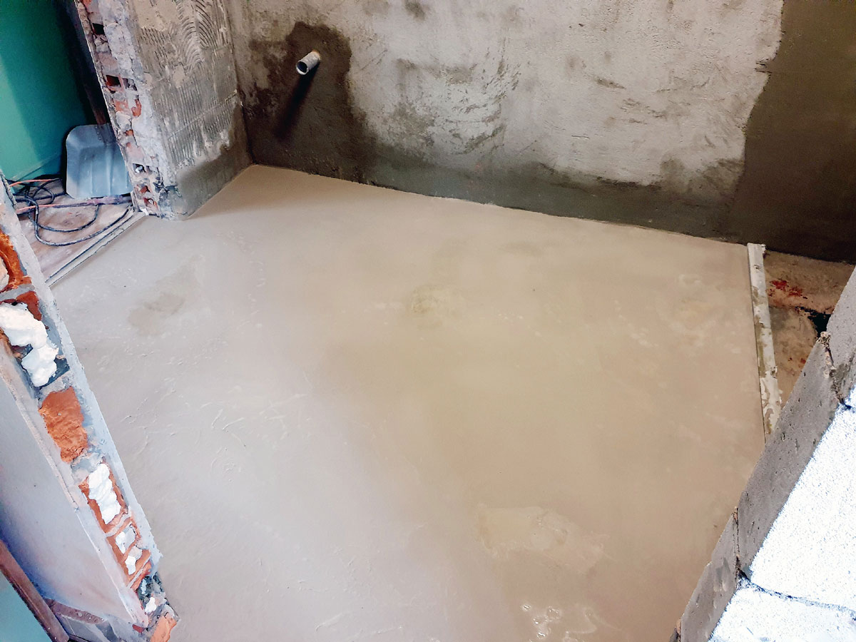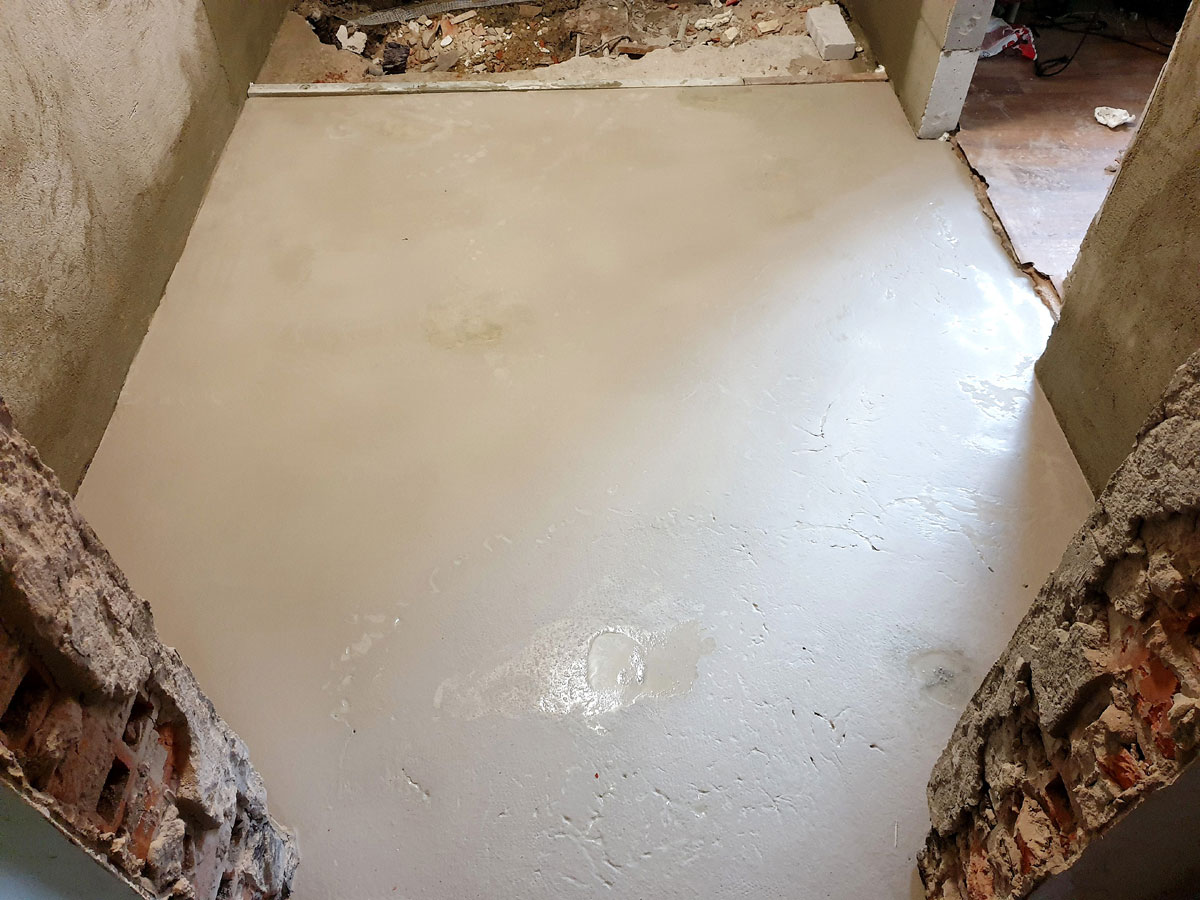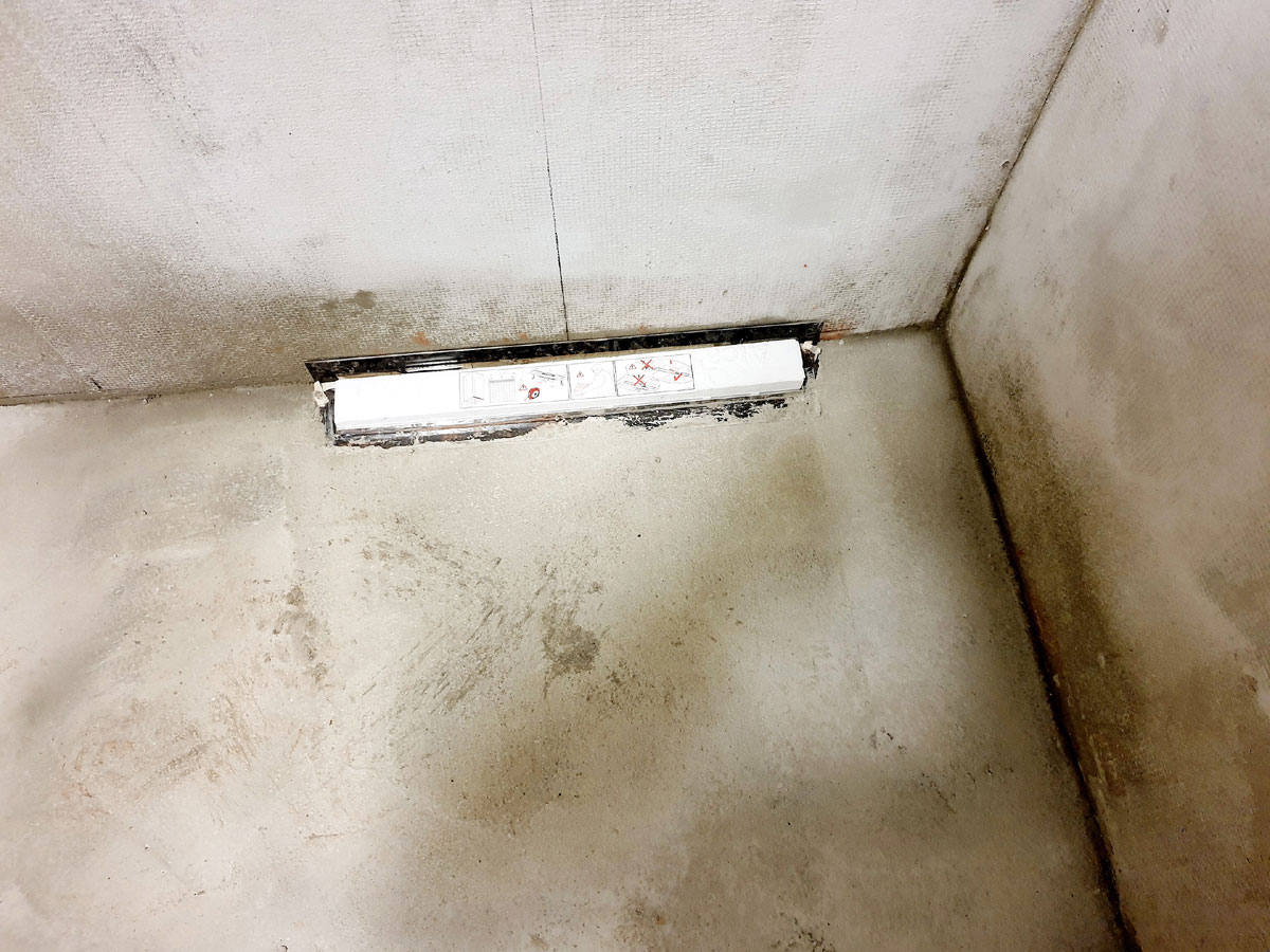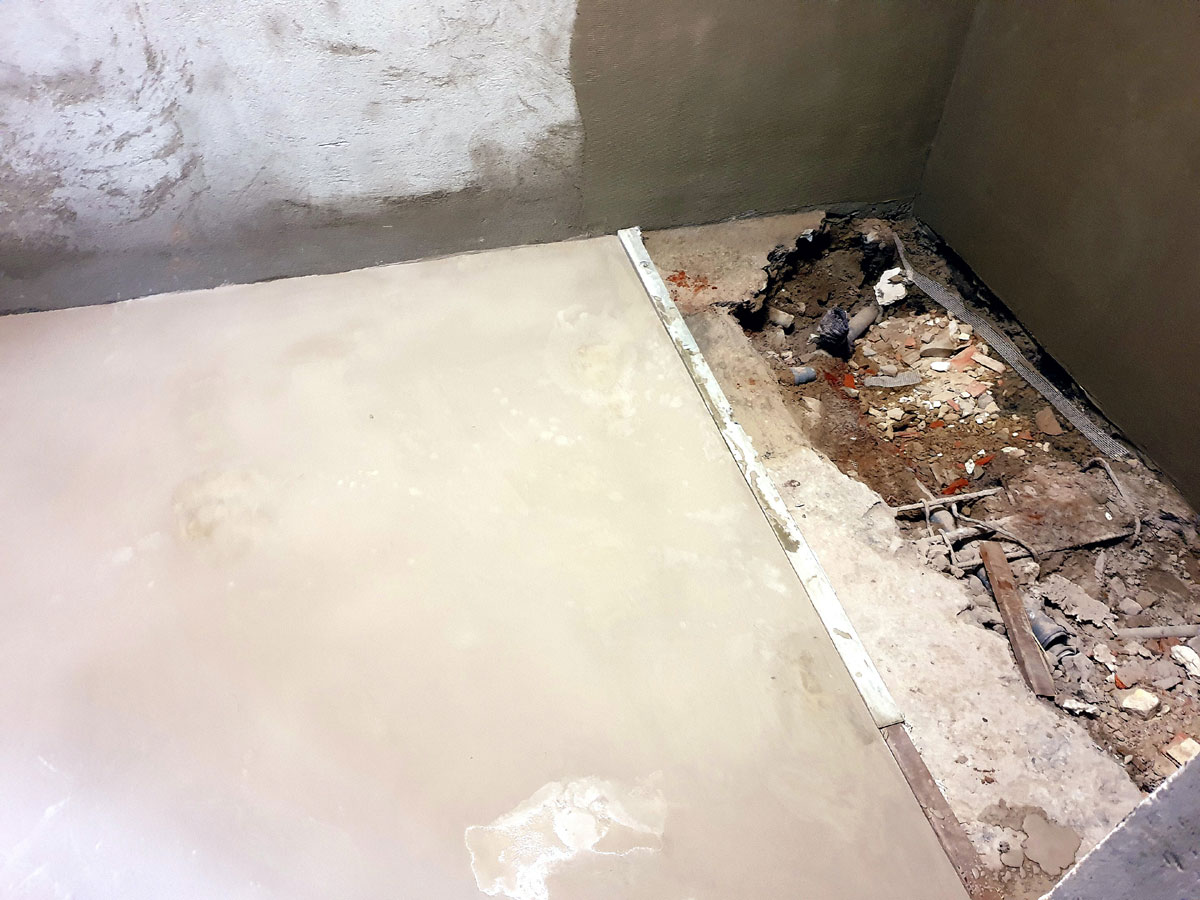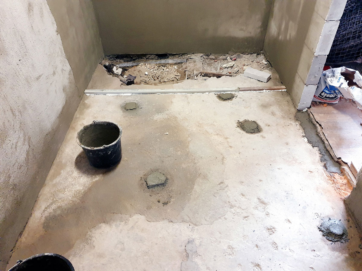 No a po přípravě otvorů přišla na řadu podlaha. Provedli jsme novou podlahu celé sprchy s instalovanými žlaby pro odvod vody ze sprch. Na podlahu se můžete podívat na následujících fotkách. |