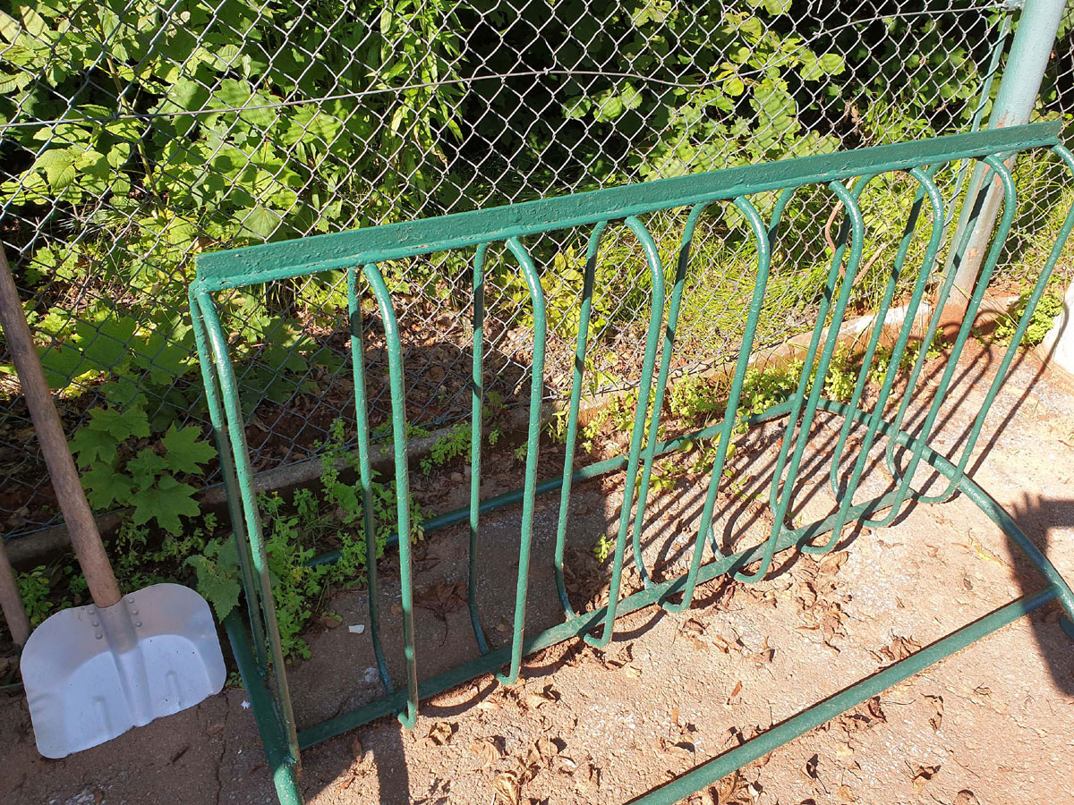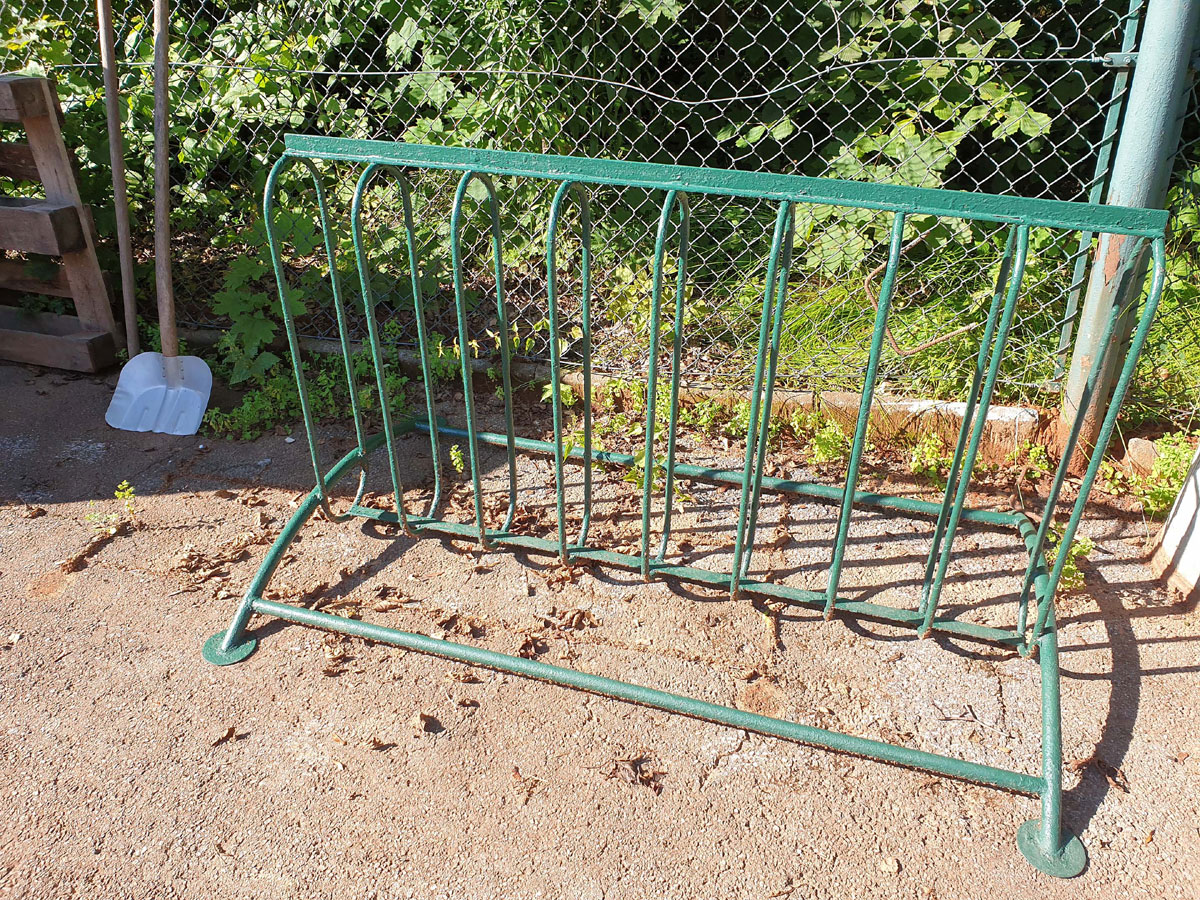No a když už jsme byli u těch nátěrů, tak jsme stejnou zelenou barvou jako u sloupků natřeji stojany na kola. Také to potřebovaly.