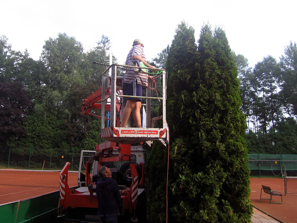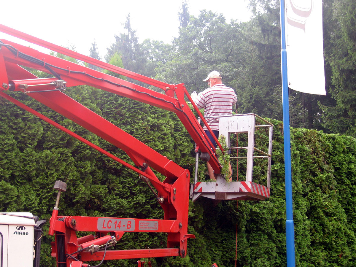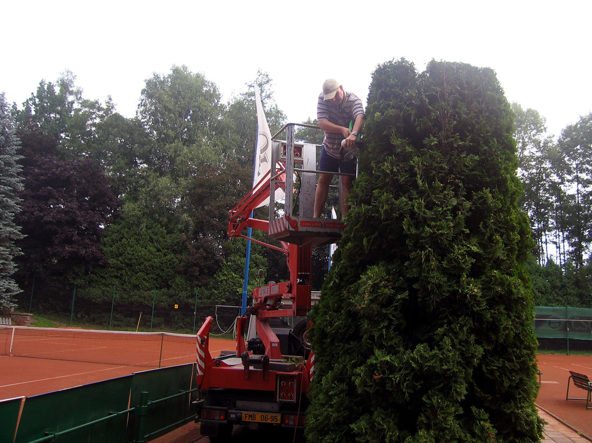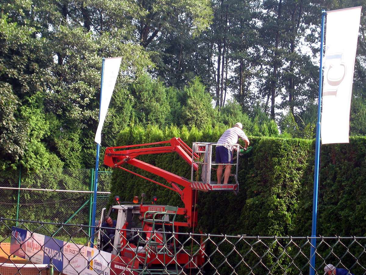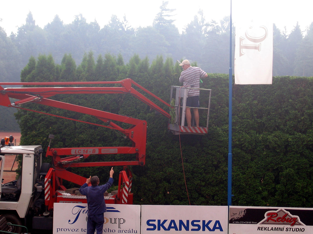 Po třech letech jsme se opět rozhodli, že ostříháme a zarovnáme tůje na dvorcích. Práce se chopil vlastními silami pan Roman Hladonik, který pomocí plošiny a svého křovinořezu zvládl náročnou práci za zhruba 8 hodin. |