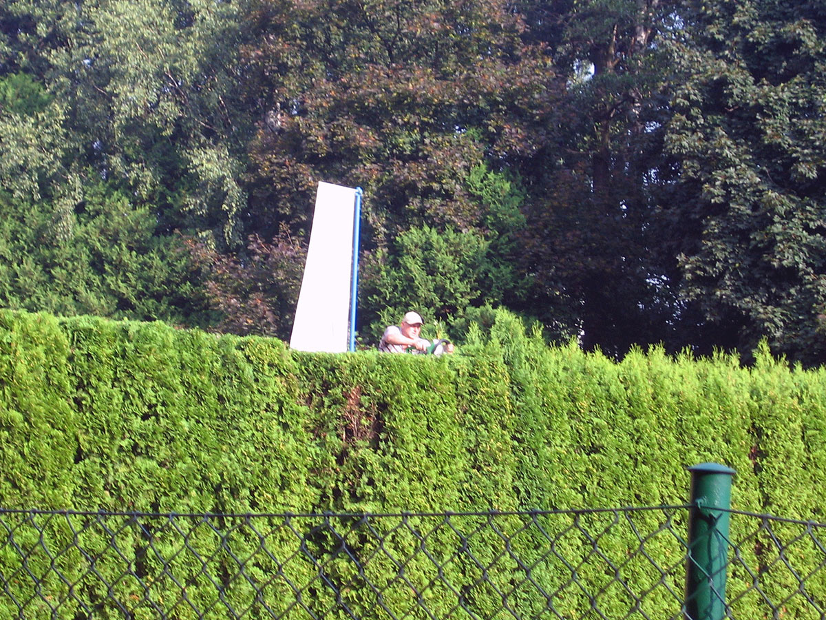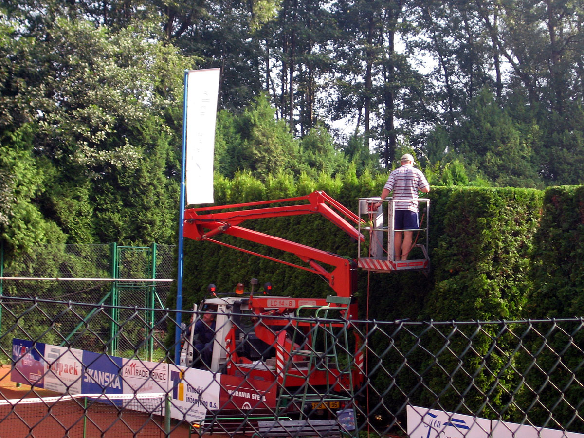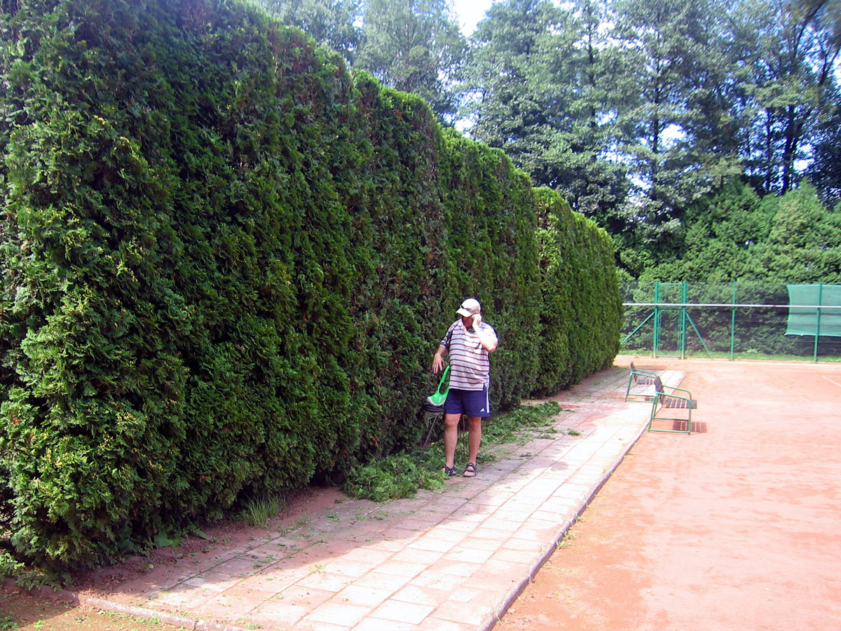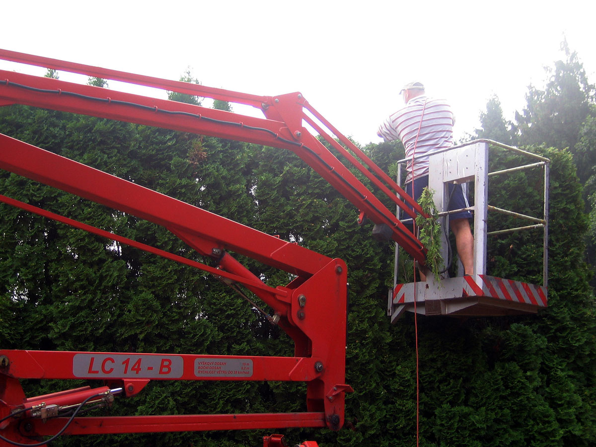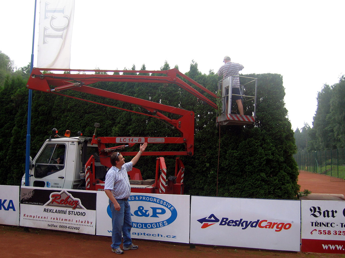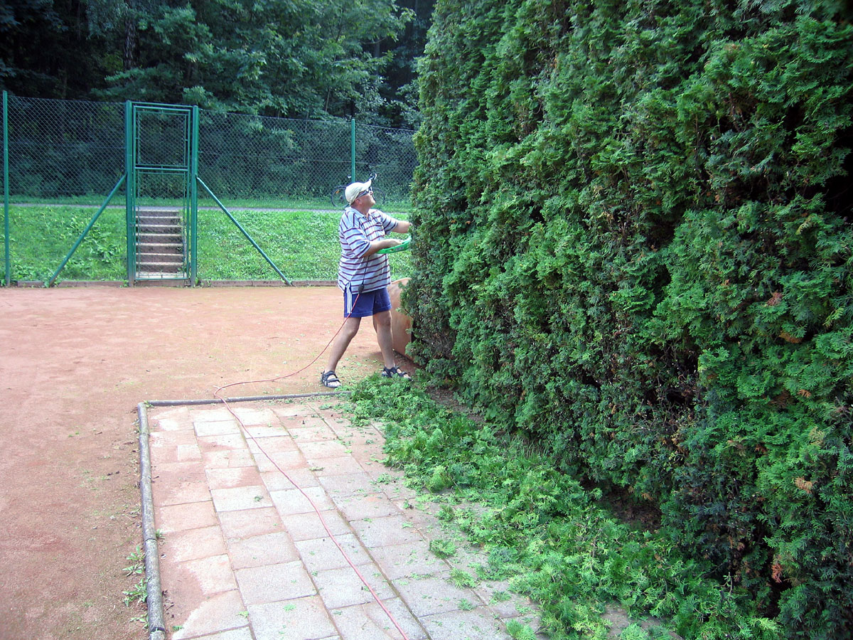 Po třech letech jsme se opět rozhodli, že ostříháme a zarovnáme tůje na dvorcích. Práce se chopil vlastními silami pan Roman Hladonik, který pomocí plošiny a svého křovinořezu zvládl náročnou práci za zhruba 8 hodin. |