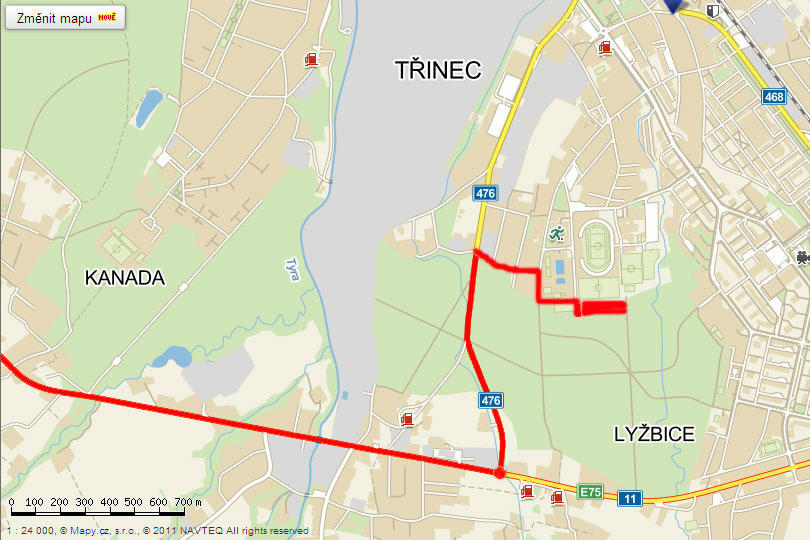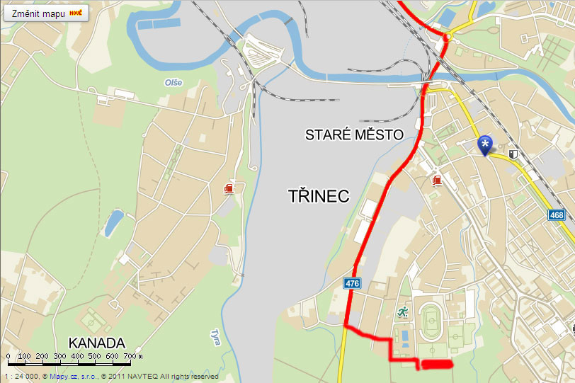 Mapa příjezdu k tenisovému areálu od Českého Těšína, Karviné
