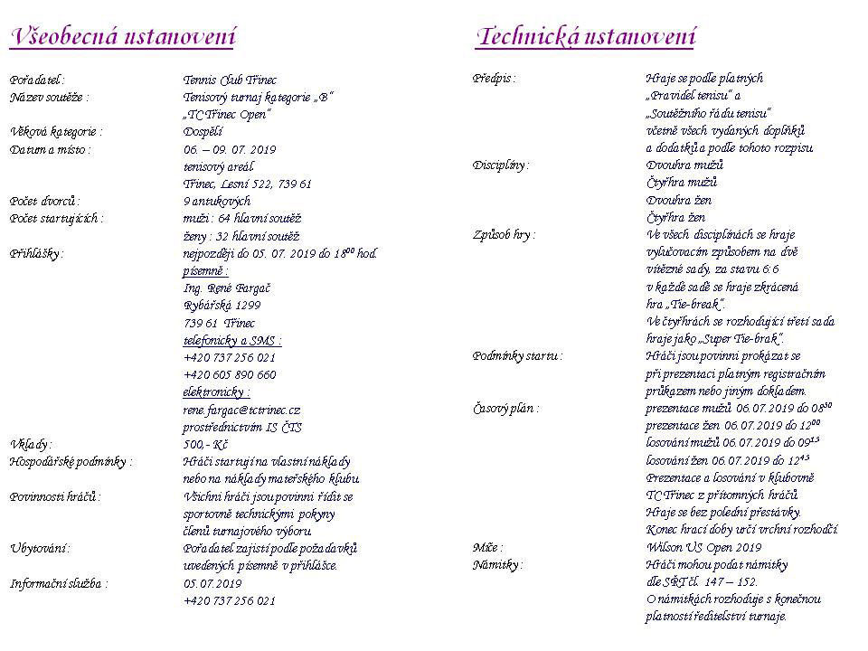 Dospělí 2019 - TC Třinec Open - propozice
