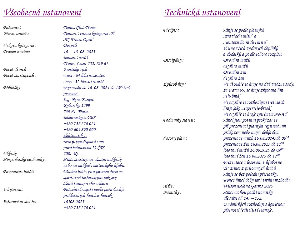 Dospělí 2025 - TC Třinec Open - propozice